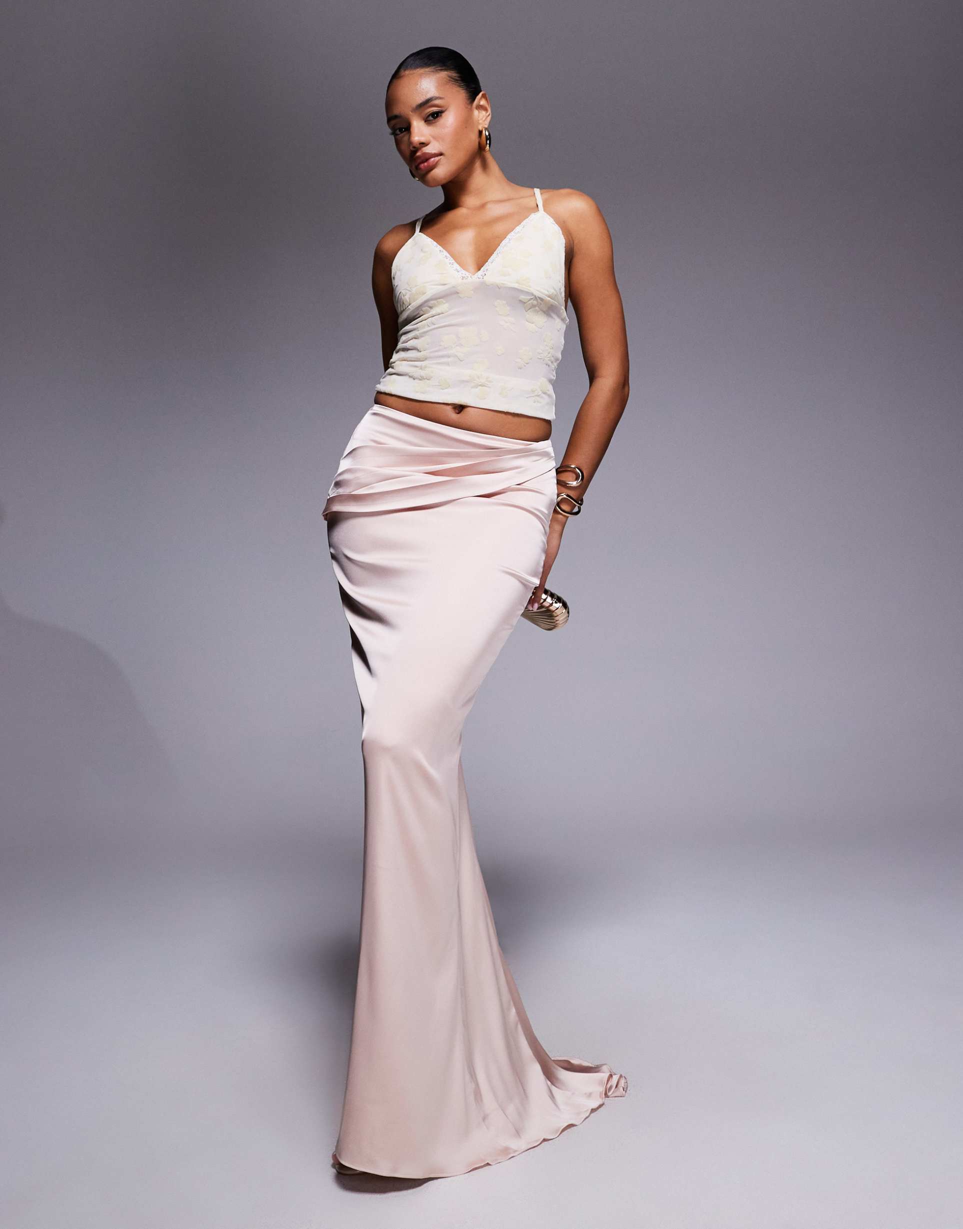 Wrap into evening elegance with the Oh Polly Kelda drape maxi skirt in blush. This satin-inspired silhouette gleams with a glossy, silky-smooth finish and a fluid drape that hugs the hips before cascading into a soft, floor-skimming train. The mermaid‑like cut sits close through the waist and hips for a lean, sculpted look, while a concealed zipper ensures a seamless line. Pair with a satin camisole and strappy heels for a refined date night or vacation soirée, and let the mid-rise, flat-front waistband anchor the gleaming fabric through every step. A versatile, statement-making staple that elevates formal nights and luxe leisure alike.