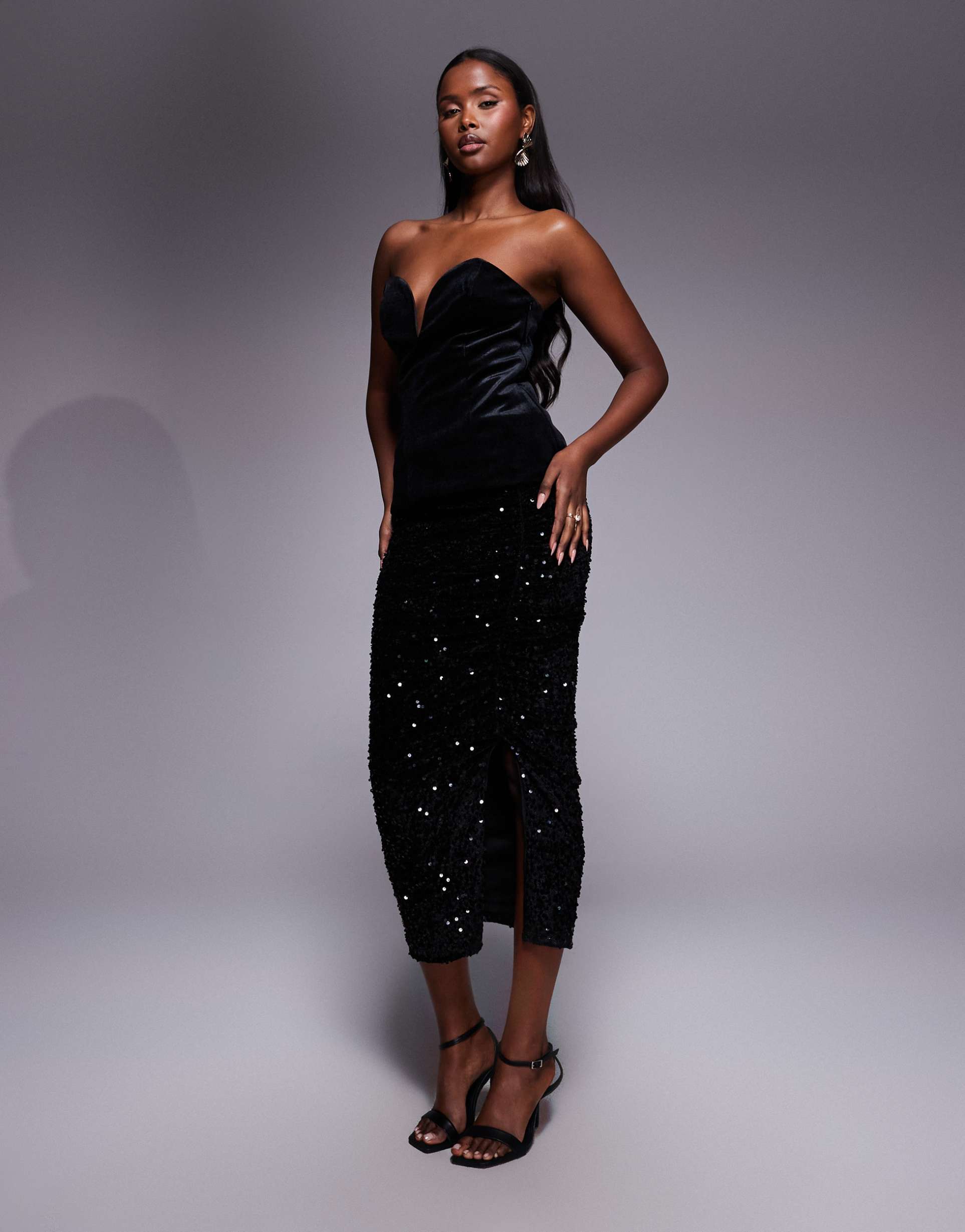 Bring a touch of refined glamour to your evening wardrobe with this River Island ruched side velvet midi skirt. Crafted from plush black velvet adorned with shimmering black sequins all over, it features elegant ruched detailing along the sides and a tasteful side slit that adds movement and allure. The regular fit and flat-front waistband create a flattering silhouette that pairs beautifully with strapless tops or sleek blouses. Perfect for cocktail parties, night outs, or semi-formal occasions, this skirt blends classic sophistication with modern sparkle for a standout statement piece.