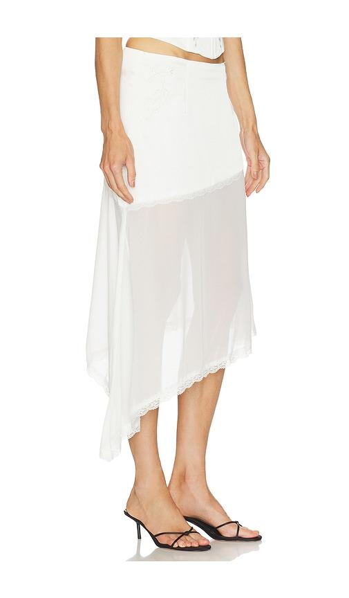 RUNAWAY THE LABEL EMBERLY MIDI FLOUNCE SKIRT IN WHITE.