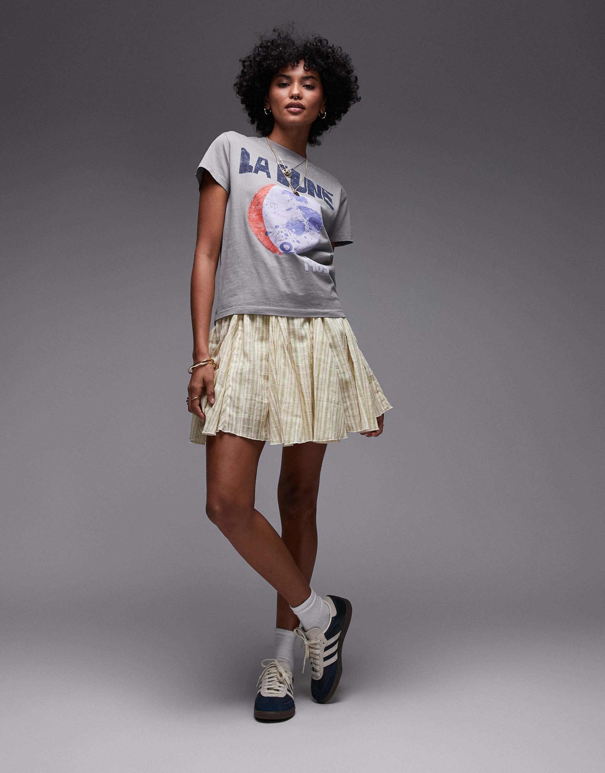 Joyful and versatile, this cotton flippy mini skirt brings motion and color to everyday outfits. The Topshop-inspired piece features a high-rise elastic waistband and a lightweight 100% cotton weave that’s soft, breathable and easy to wear. Stripes in sunny yellow and fresh green run all over, while clever godet panels create a playful, fluttery silhouette with every step. Pair it with a graphic tee and sneakers for casual days, or dress it up with a silky blouse and sandals for brunch dates. A bright, easy-to-style staple that moves with you through spring and summer.