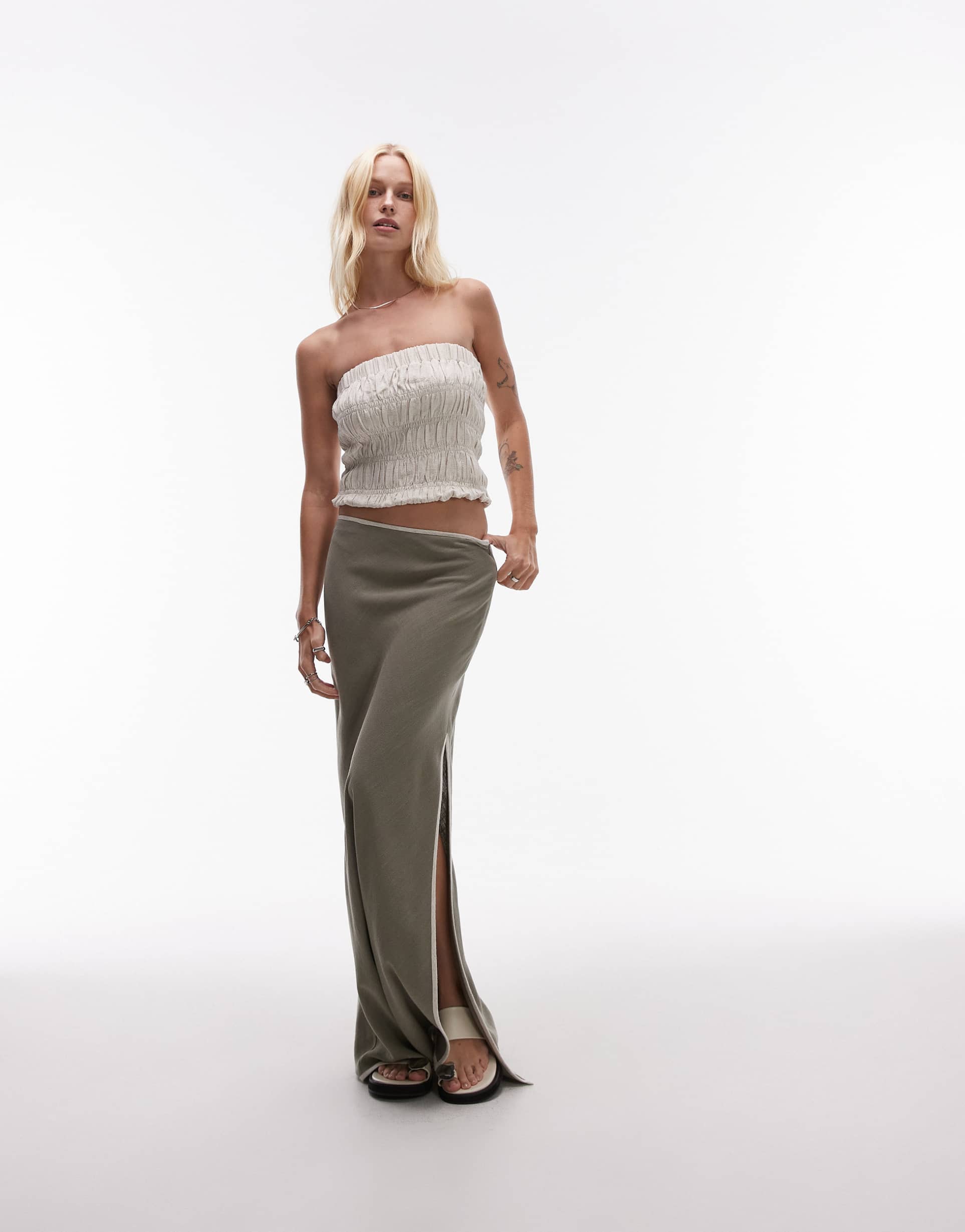 TOPSHOP LINEN BIAS MAXI SKIRT IN GREEN WITH CONTRAST PIPING