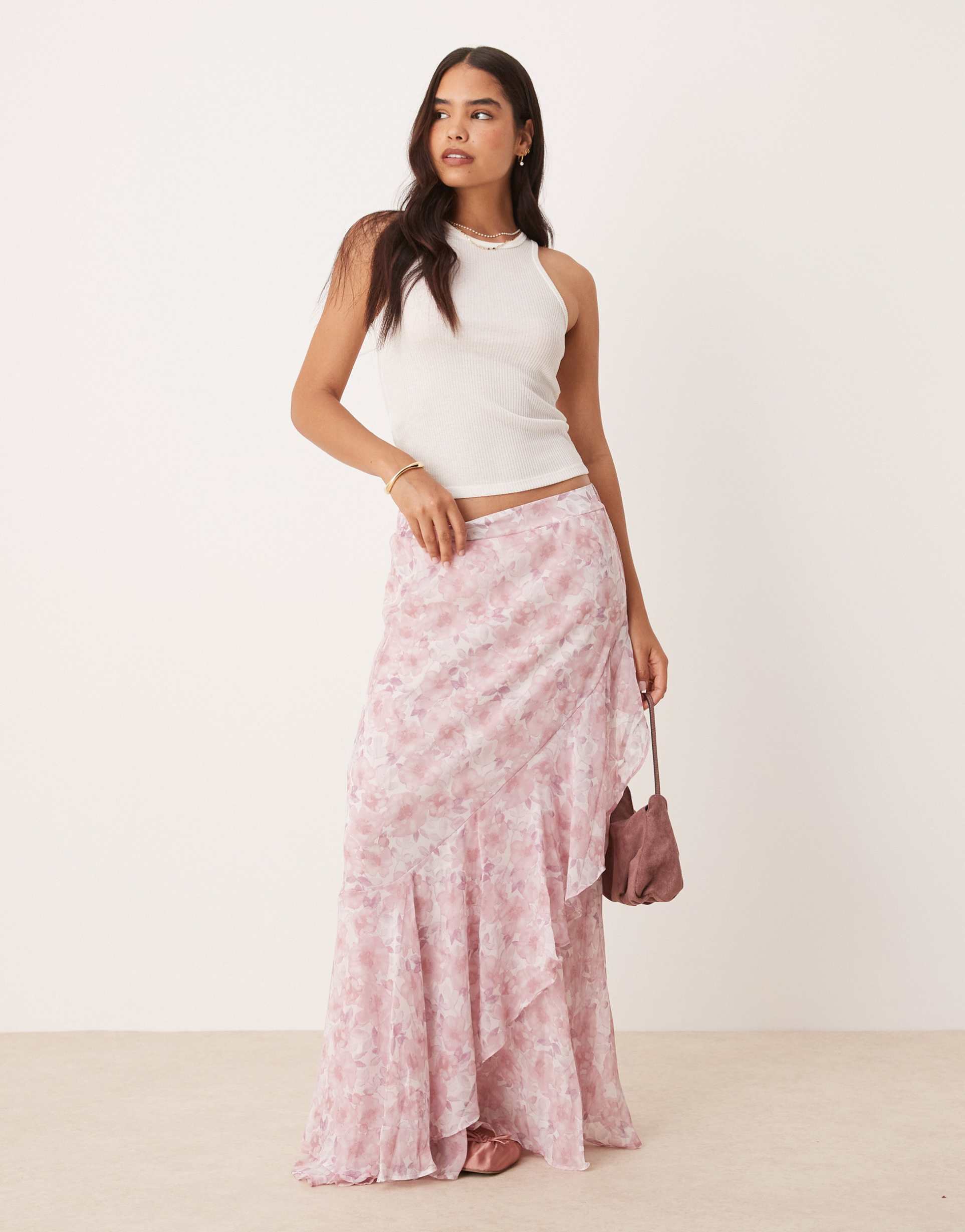 VILA CHIFFON RUFFLE DETAIL BOHO SKIRT IN FLORAL PRINT