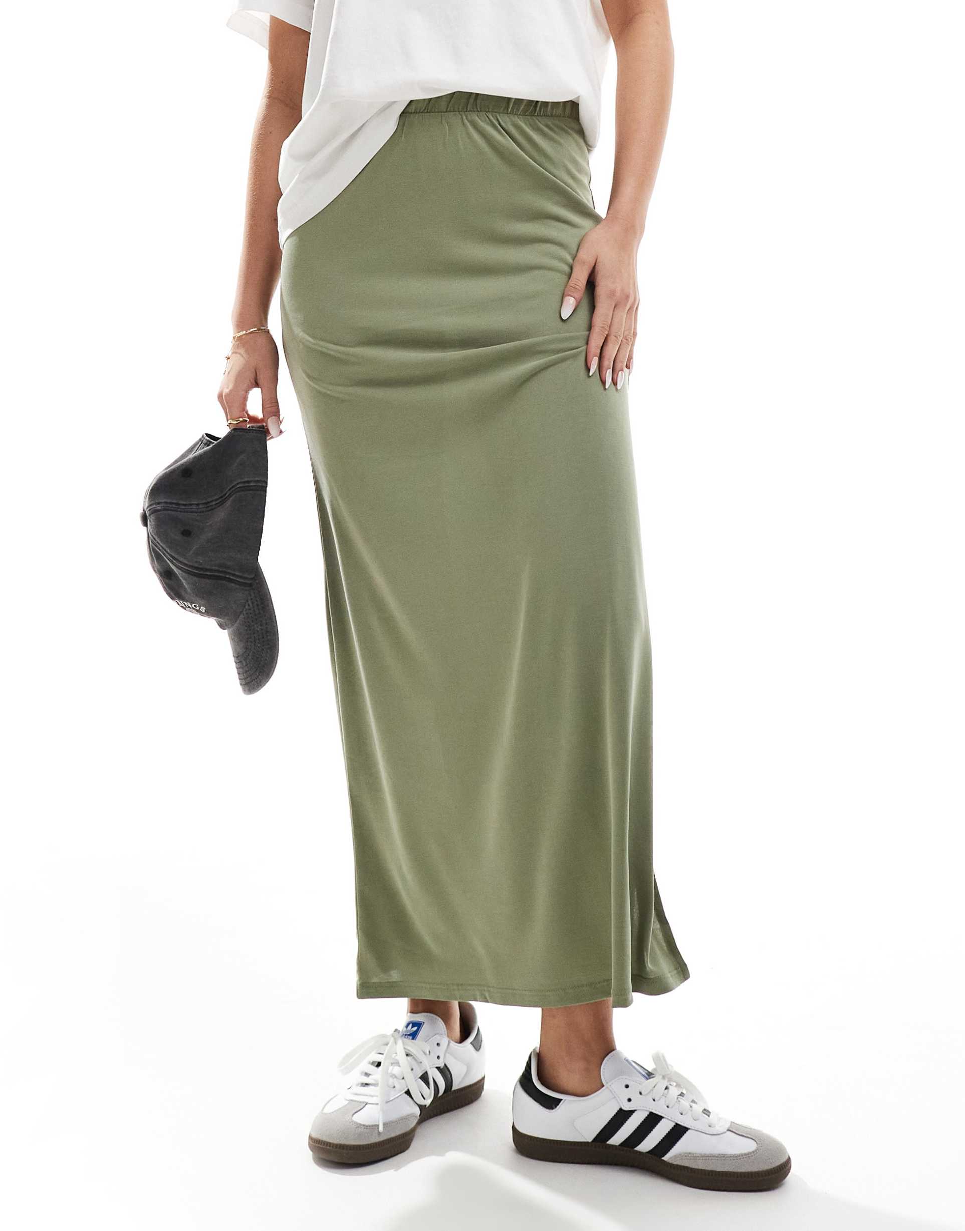 Soft, sculpted and super wearable, Vila’s slinky green maxi skirt drapes in a fluid modal-poly blend for everyday ease. The high-rise elastic waistband flatters the silhouette while the solid olive fabric falls to a full-length hem with a discreet front slit that adds movement. Dress it up with a satin blouse and sandals, or keep it casual with a tee and sneakers for weekend errands. This versatile piece brings quiet luxury to warm-weather days and easy travel days alike, proving that a simple, well-cut maxi can elevate any look.