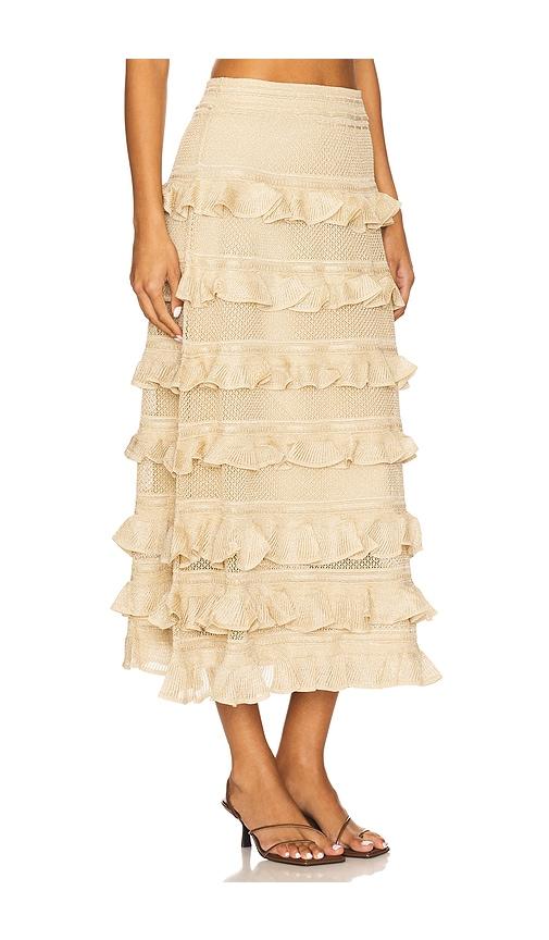 ZIMMERMANN LACE FRILL MIDI SKIRT IN METALLIC GOLD.