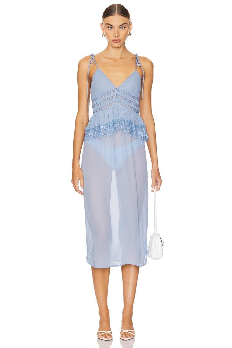 Soft chiffon fabric with delicate lace trim and ruffle details create a romantic and airy slip dress in a light blue hue. The slim silhouette features a flattering V-neckline and adjustable self-tie spaghetti straps, complemented by a smocked back for comfort. The midi length with a side slit adds graceful movement, perfect for spring and summer occasions such as casual brunches, date nights, or relaxed outings. Sheer and unlined, this dress offers an effortlessly feminine style with versatile appeal for warm weather dressing.
