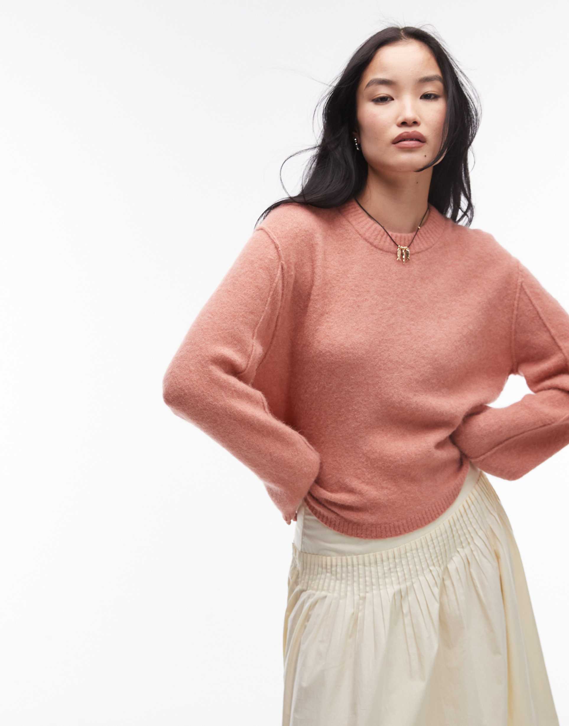 This cozy knit sweater features a regular fit with a crew neck and long drop-shoulder sleeves, crafted from a soft alpaca and wool blend with polyamide and elastane for comfort and stretch. The muted peach color enhances its casual chic vibe, while ribbed trim and seam details add subtle texture to the front, sleeves, and hem. Perfect for autumn and winter casual wear, loungewear, or relaxed workwear, this fluffy sweater combines warmth with minimalist style for everyday versatility.