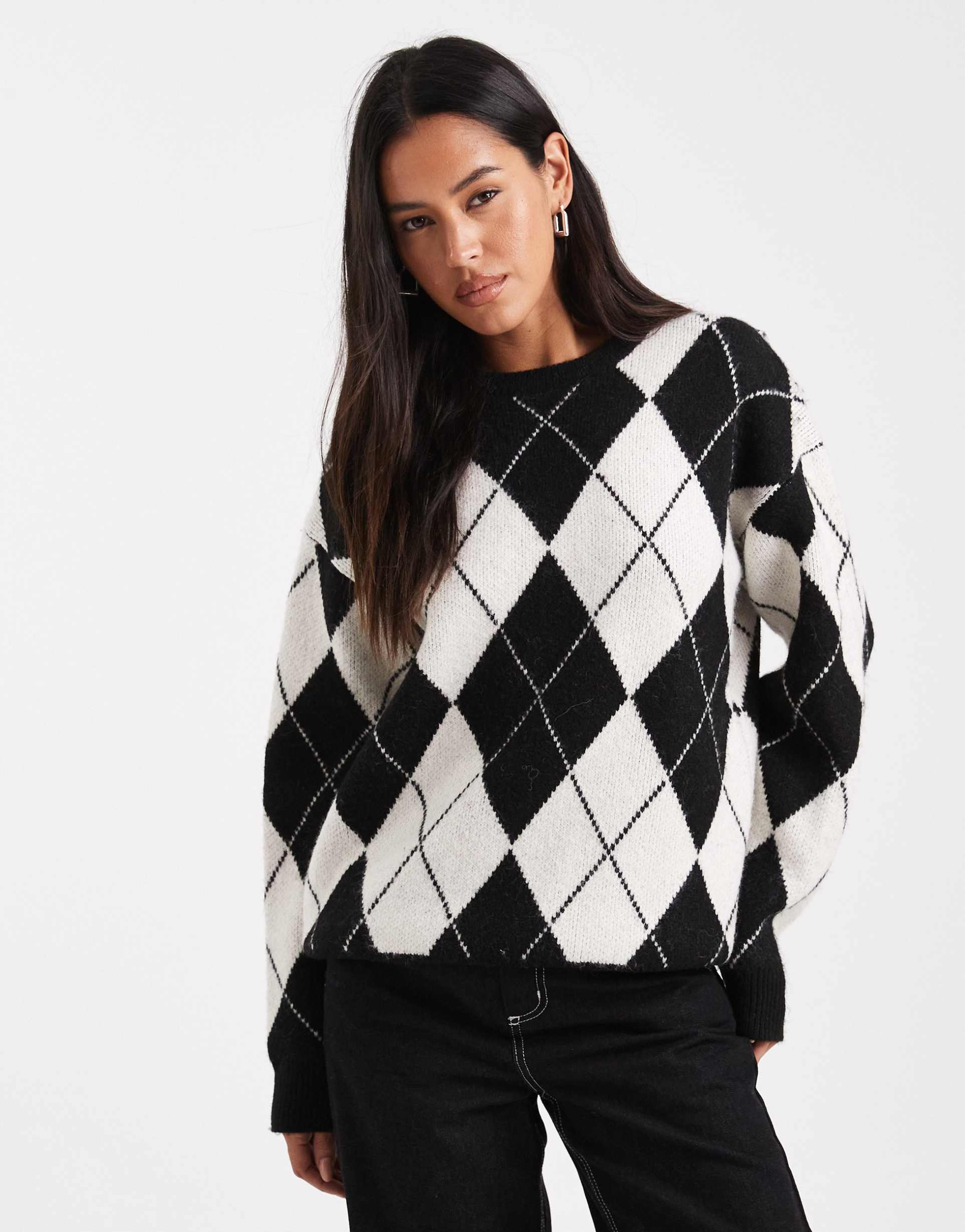 4TH & RECKLESS WOOL BLEND CREW NECK OVERSIZED SWEATER IN BLACK AND WHITE ARGYLE