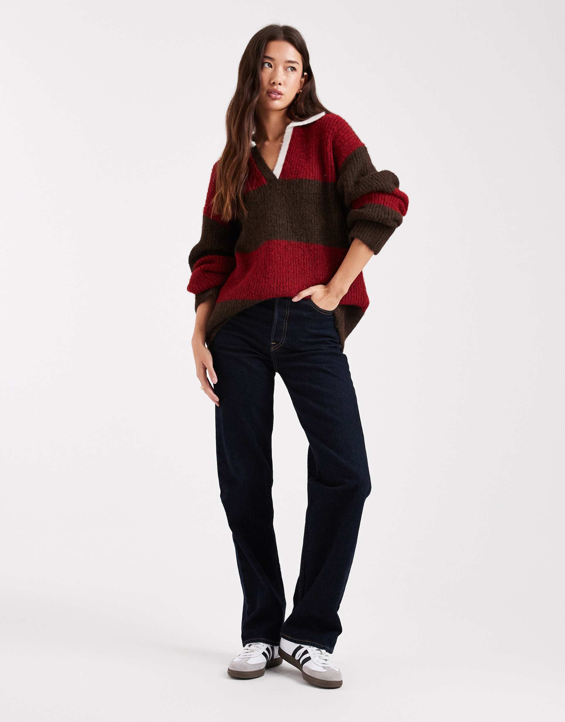 This oversized rugby knit sweater features a classic V-neck and spread collar, crafted from a wool blend that includes polyester and nylon for warmth and durability. The sweater showcases bold cherry and chocolate horizontal stripes across the hip-length silhouette and long sleeves with regular styling. Designed for a relaxed, casual fit, it is perfect for autumn and winter wear. Its pullover closure adds to the ease of wear, making it a versatile piece for casual outings, streetwear looks, or cozy loungewear days.