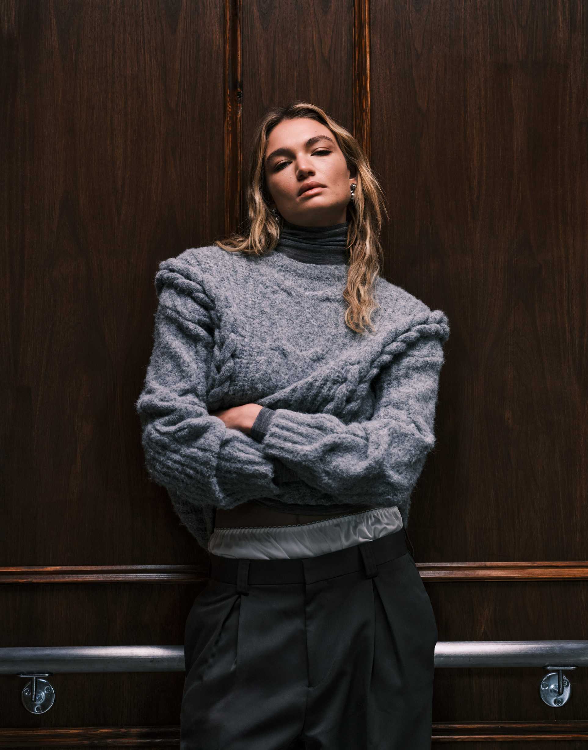 4TH & RECKLESS WOOL FEEL FLUFFY KNIT DROPPED SHOULDER CABLE DETAIL SLOUCHY OVERSIZED SWEATER IN GRAY