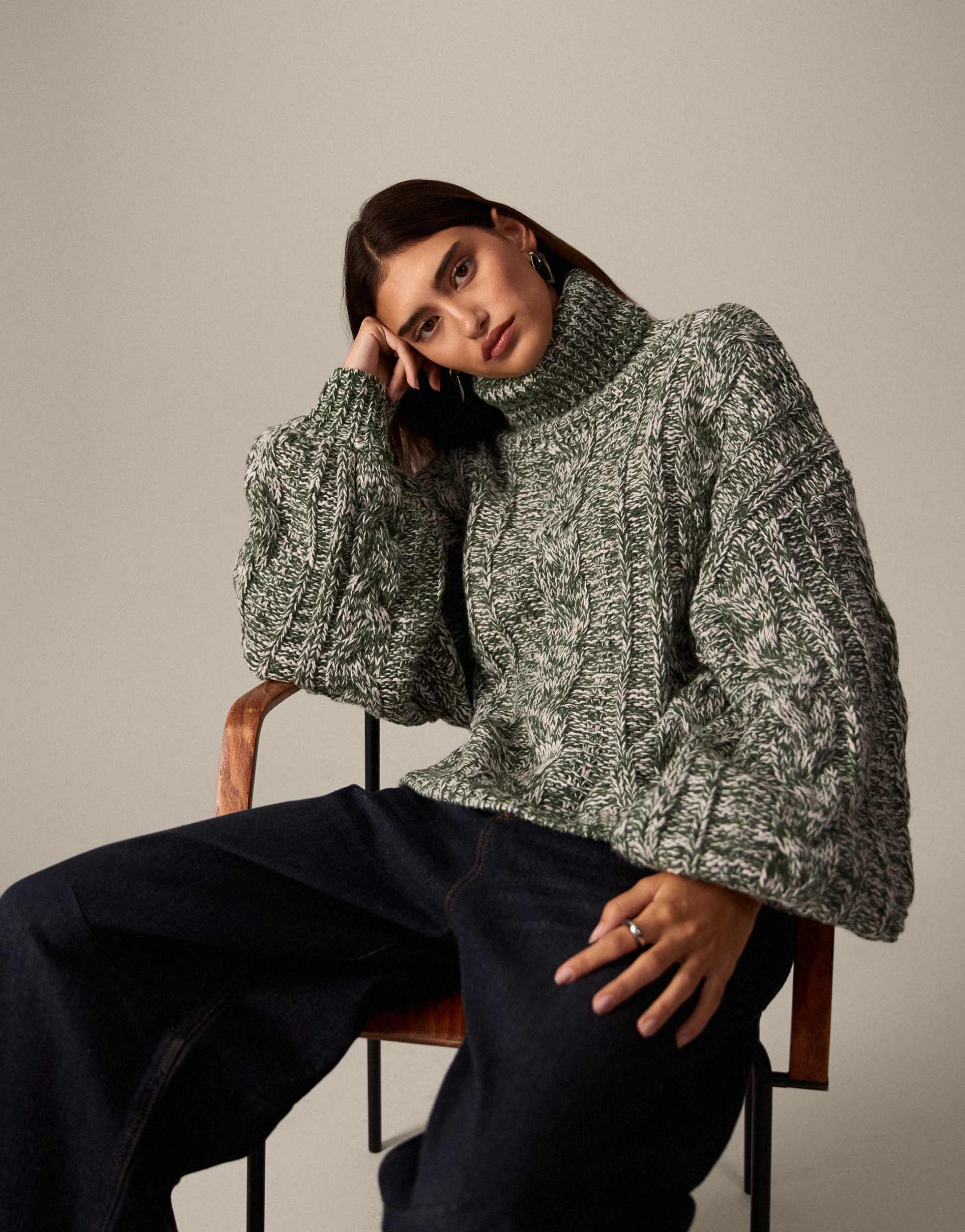 ARRANGE HIGH NECK TWISTED YARN CABLE SWEATER IN GREEN AND CREAM