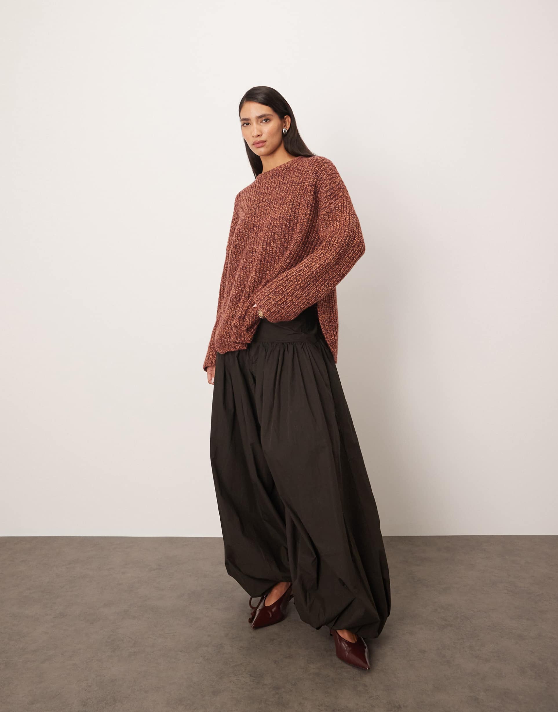 This relaxed fit sweater from ARRANGE features a crew neck and long drop-shoulder sleeves for a casual chic look. Crafted from a merino-rich wool blend with nylon, it offers warmth and softness ideal for autumn and winter. The hip-length silhouette is enhanced by a curved hem that adds subtle shape and modernity. Its solid dusty red color makes it a versatile piece suitable for casual outings, loungewear, and workwear layering. Minimalist in style, this knit sweater combines comfort with understated elegance for everyday wear.