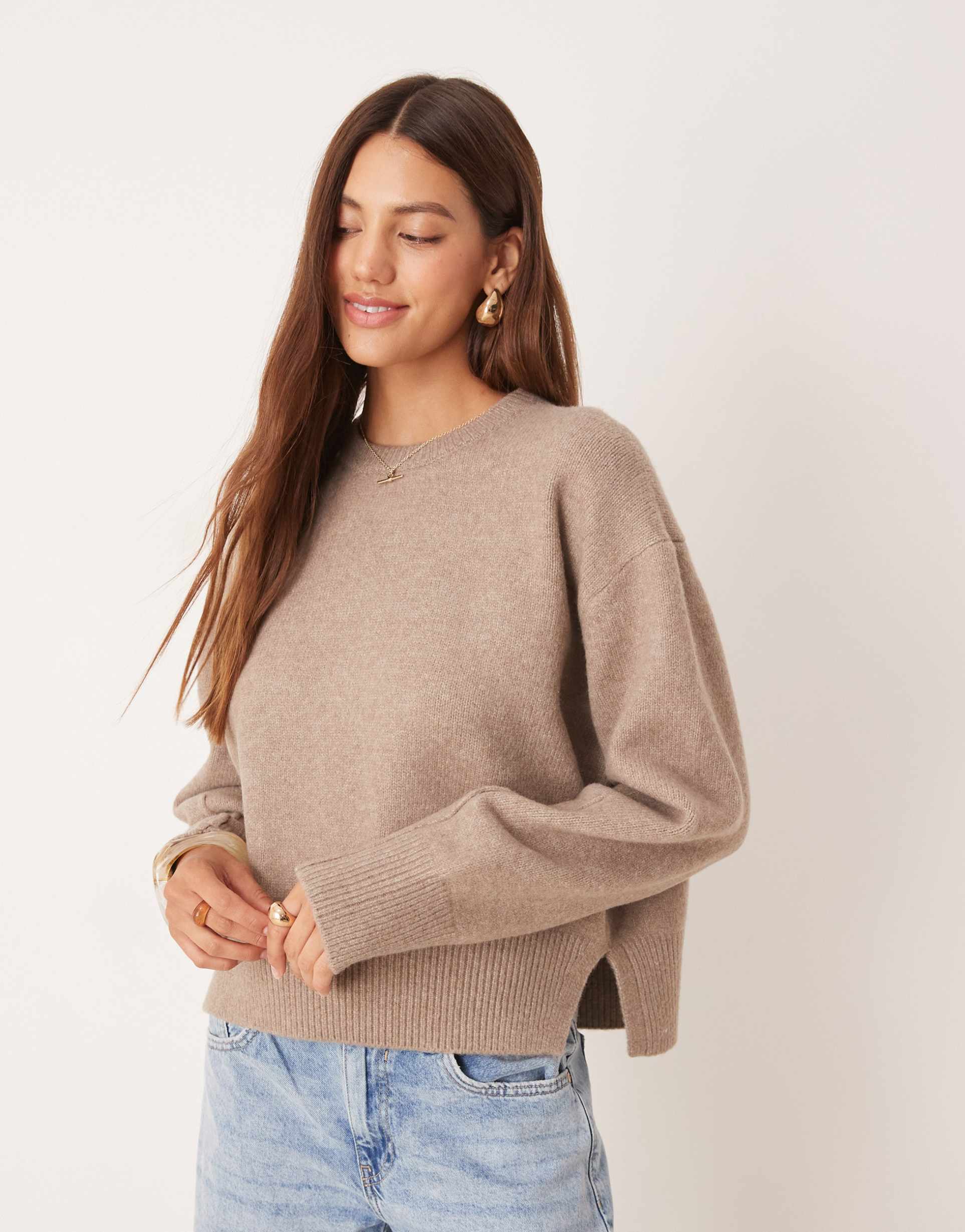 ASOS DESIGN BOXY CREW NECK SWEATER WITH SIDE SPLIT DETAIL IN MOCHA