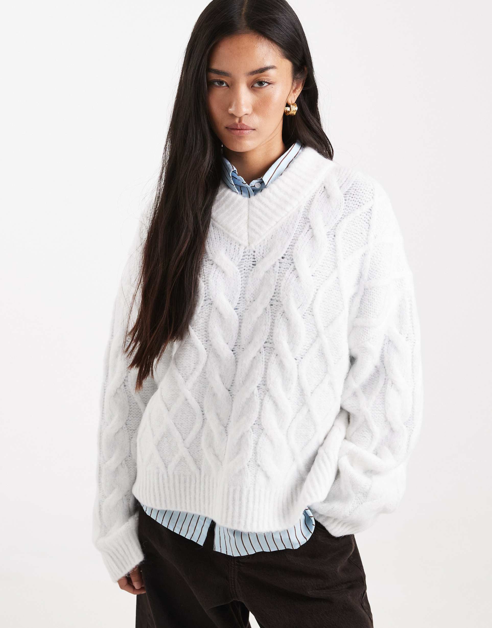 ASOS DESIGN BOXY HIGH V-NECK CABLE SWEATER IN CREAM