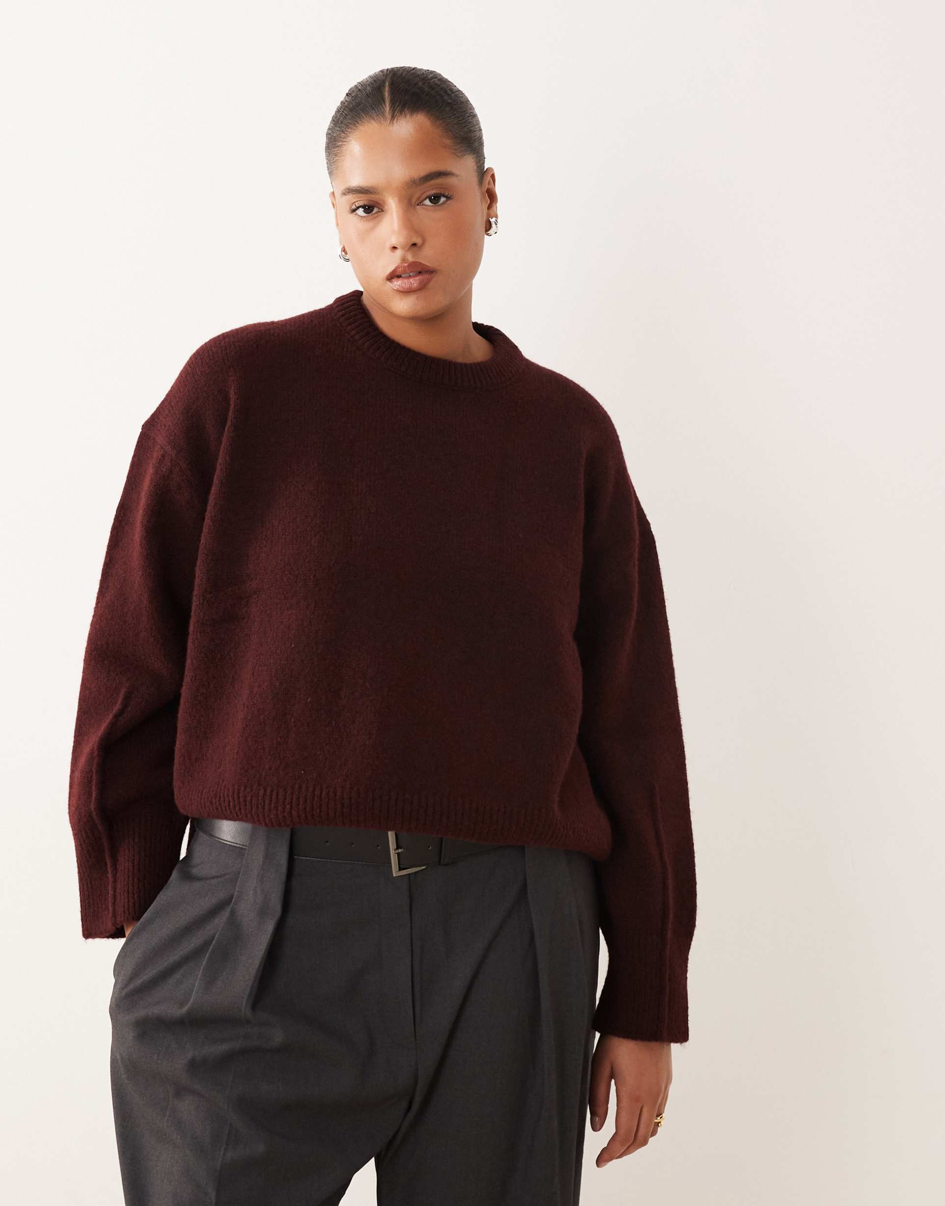 This ASOS DESIGN Curve sweater features a loose, boxy fit with a cozy crew neckline and dropped shoulders, crafted from a soft acrylic-polyester blend. The waist-length silhouette is enhanced by subtle side slit details at the hem border, offering ease of movement and casual style. Its long sleeves and rich dark plum color make it an ideal layering piece for autumn and winter seasons. Perfect for relaxed casual wear and loungewear, this sweater pairs effortlessly with a variety of bottoms for everyday comfort and laid-back chic.