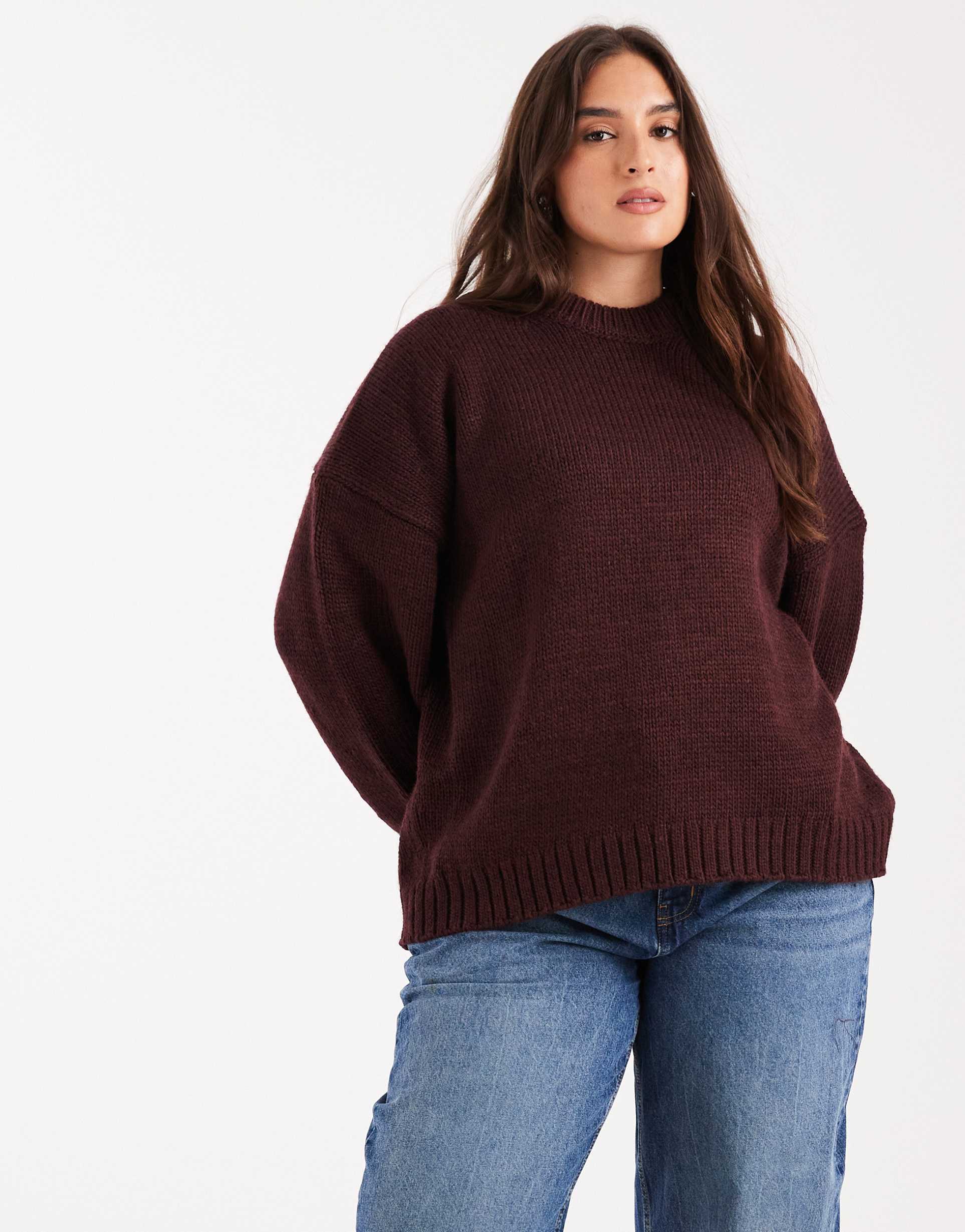 ASOS DESIGN CURVE SUPER OVERSIZED CHUNKY CREW NECK SWEATER WITH CURVED HEM IN BURGUNDY