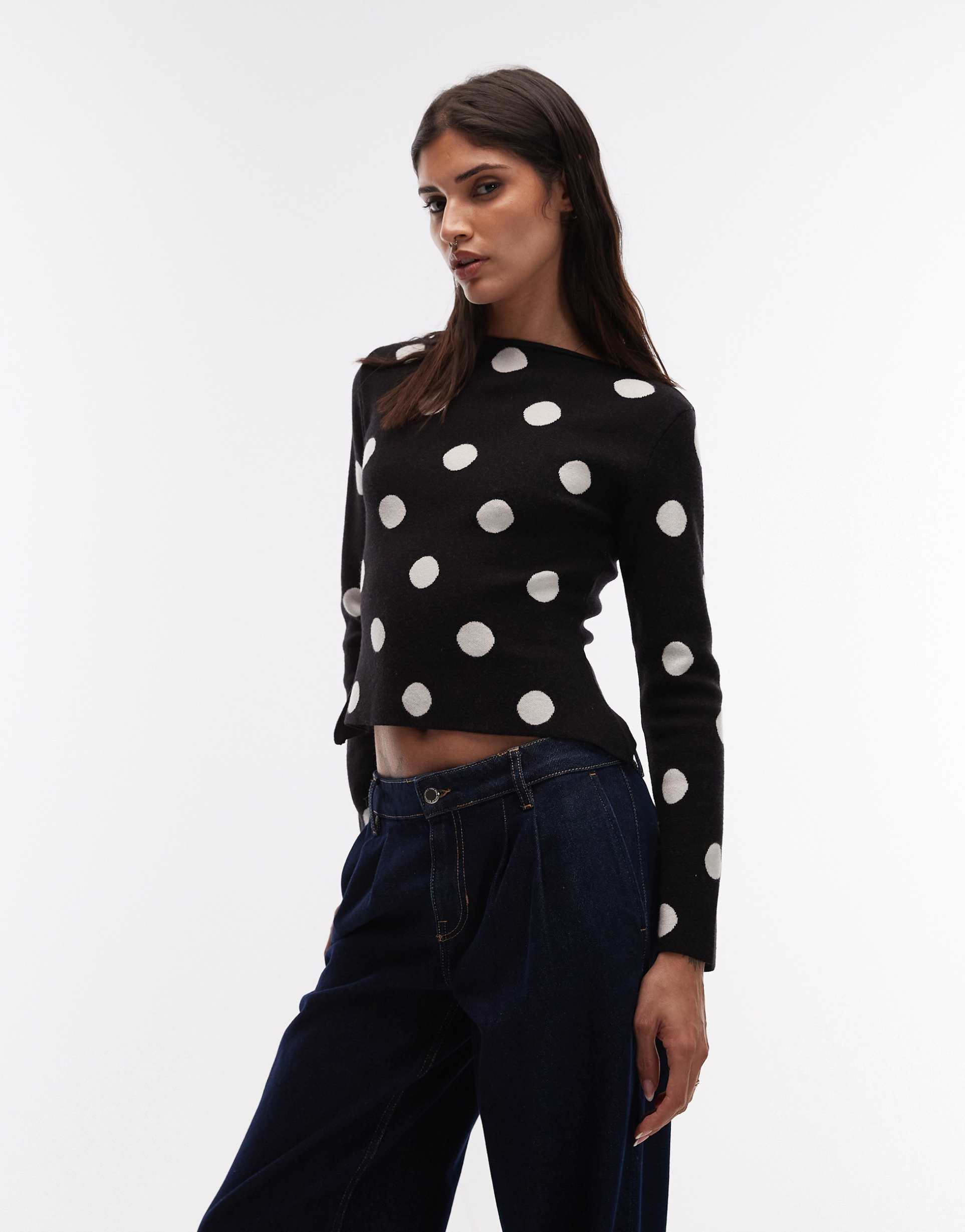 ASOS DESIGN FINE KNIT SLASH NECK SWEATER IN POLKA DOTS