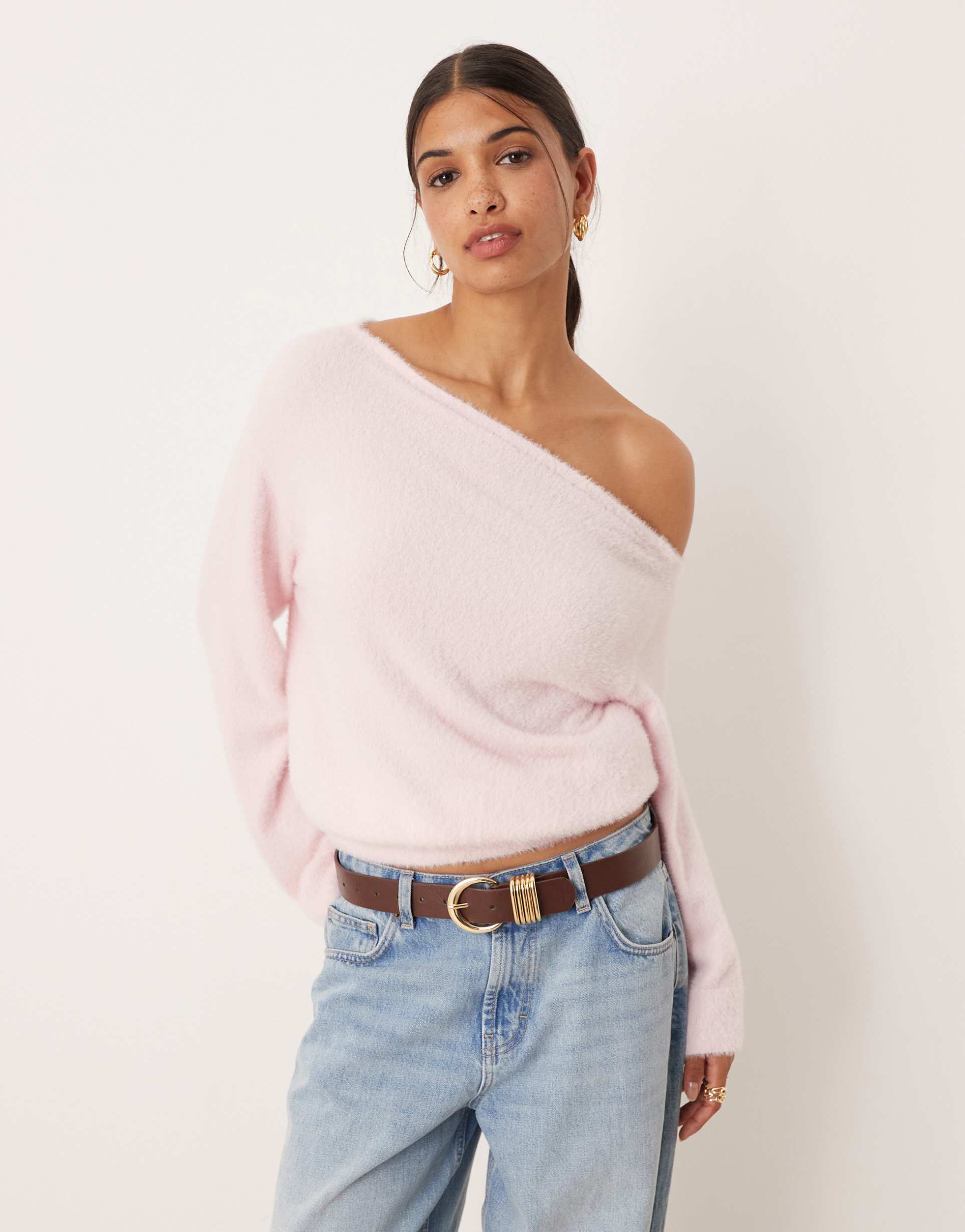 Softly textured and luxuriously fluffy, this ASOS DESIGN knit sweater features a unique one-shoulder asymmetric neckline and long sleeves. The relaxed fit is cinched at the waist for subtle definition, creating a flattering silhouette. Crafted from a cozy polyamide knit, it’s perfect for layering during autumn, winter, or spring. Its waist-length cut and solid light pink hue add a fresh and casual chic vibe, ideal for casual outings, loungewear days, or weekend brunches.