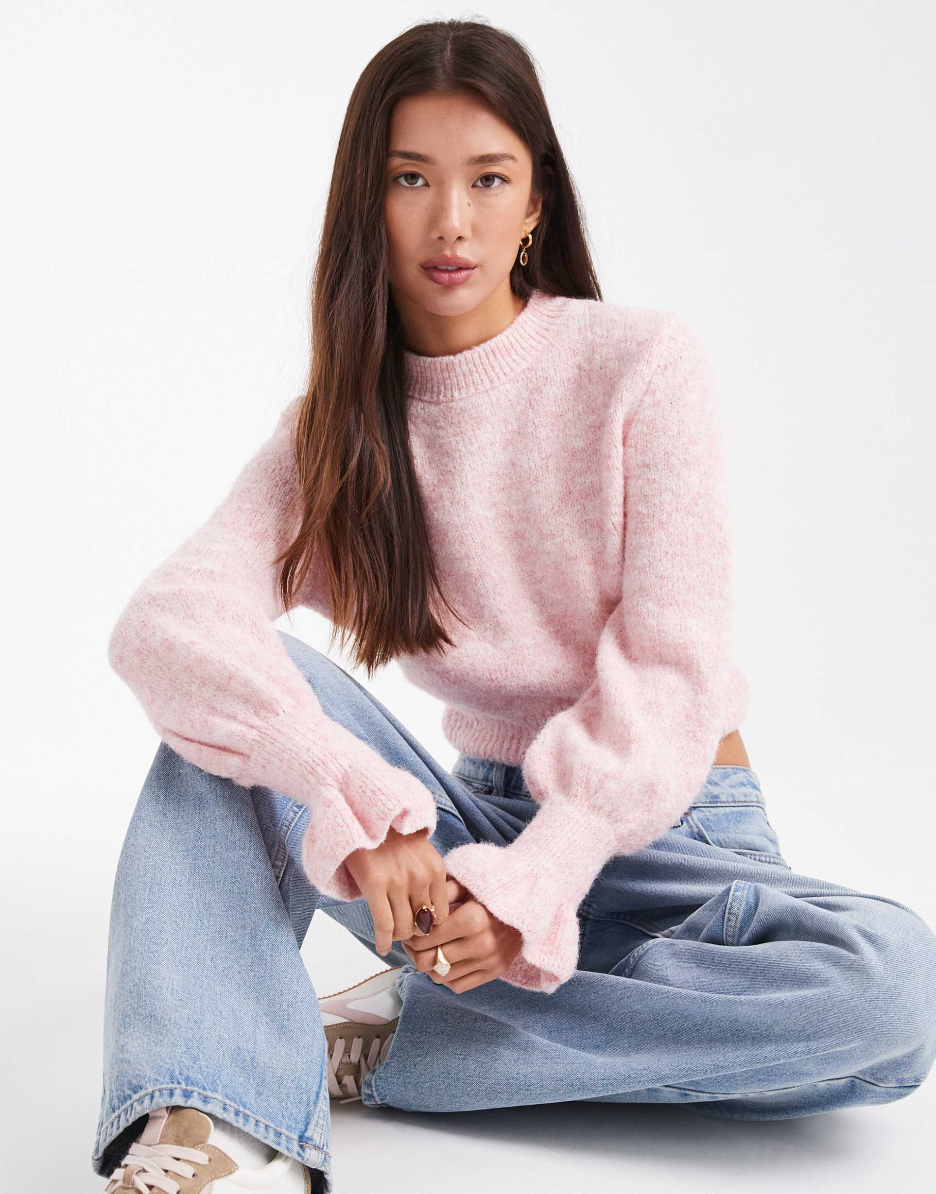 ASOS DESIGN KNIT SWEATER WITH FRILL CUFFS IN PINK