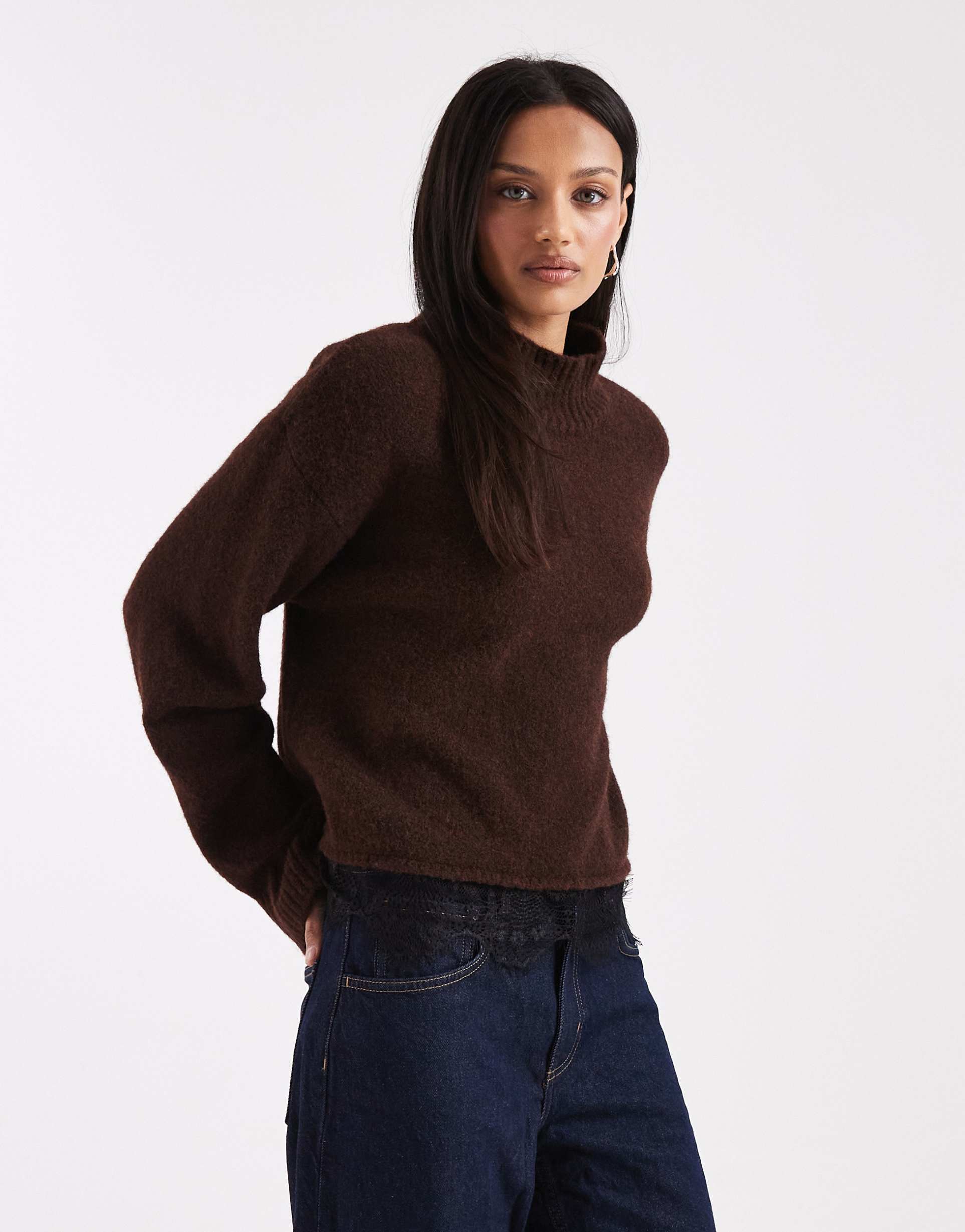 ASOS DESIGN KNIT SWEATER WITH LACE TRIM AND WOOL IN CHOCOLATE BROWN