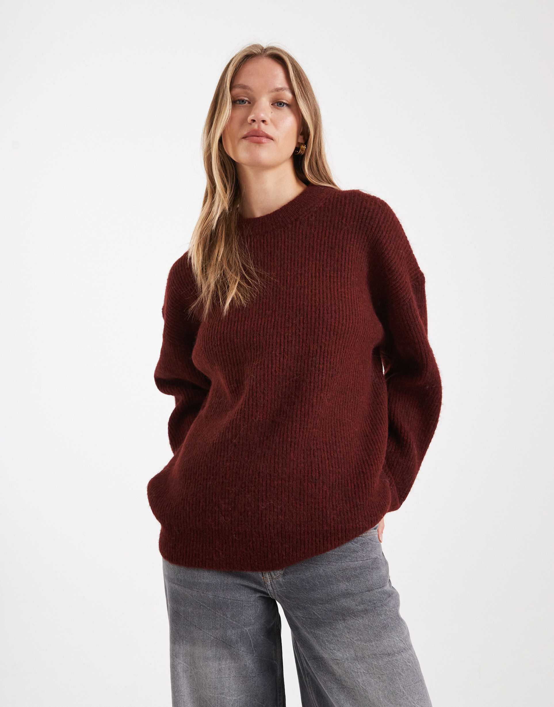 ASOS DESIGN OVERSIZED CREW NECK COCOON RIB KNIT SWEATER IN BURGUNDY