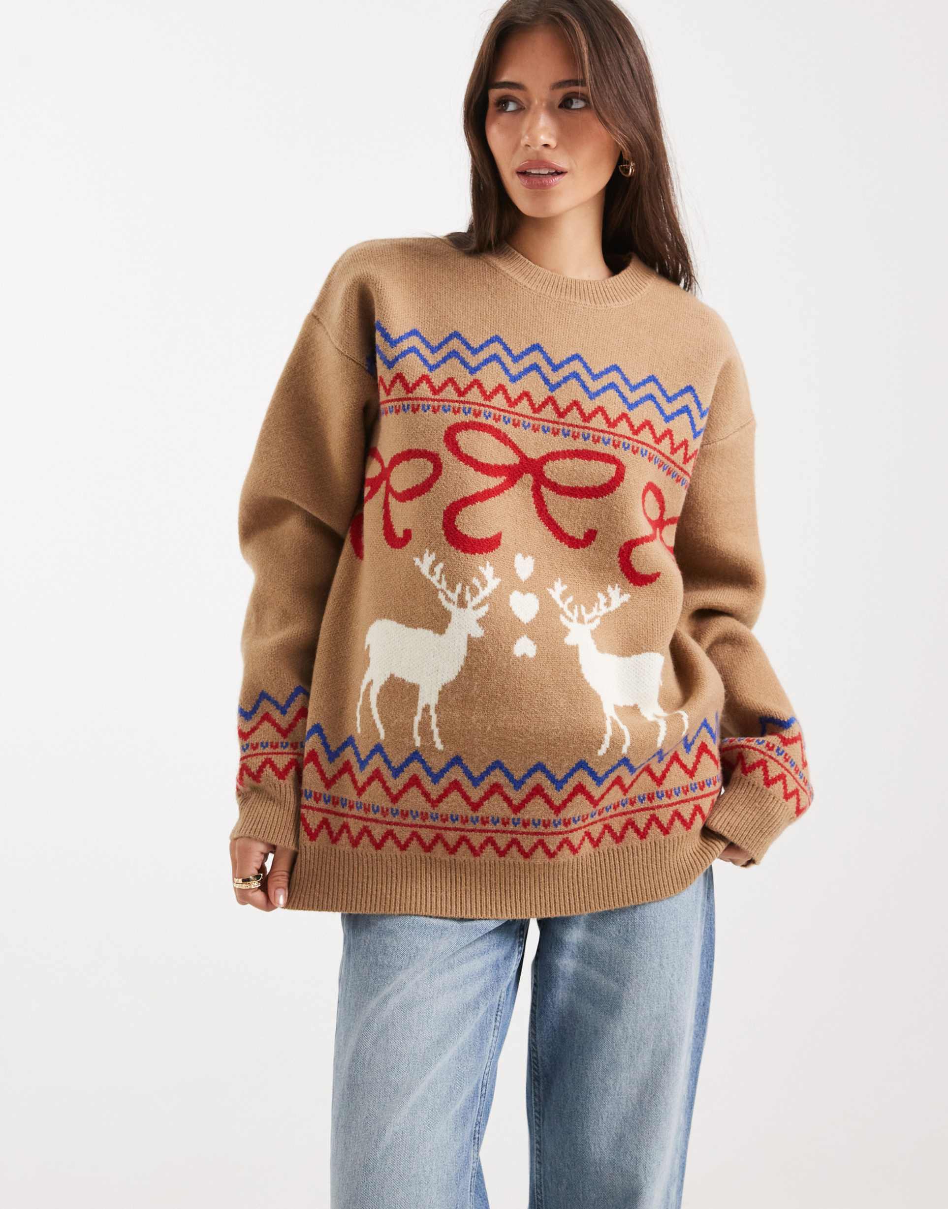 ASOS DESIGN OVERSIZED REINDEER BOW SWEATER IN CAMEL