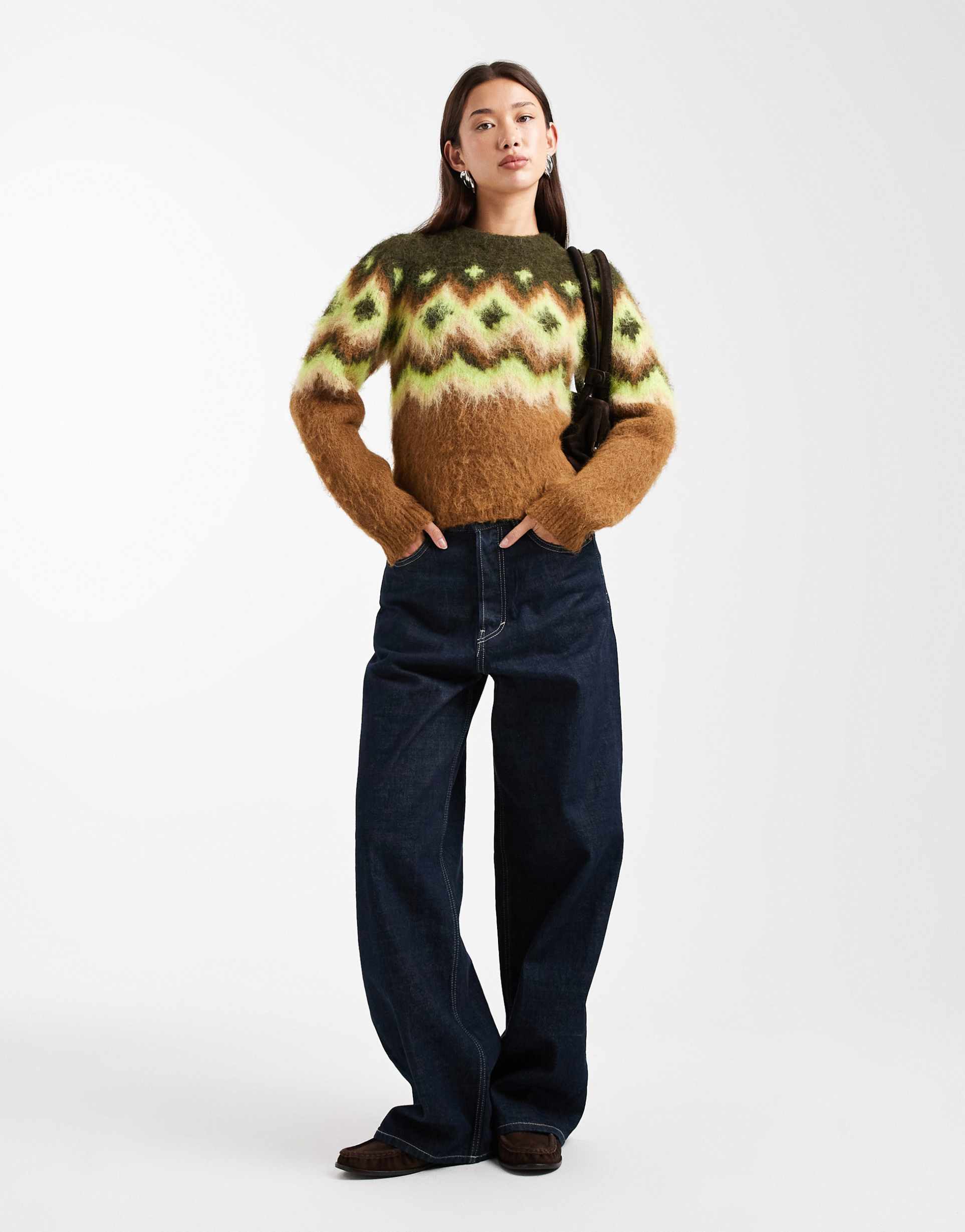 ASOS DESIGN POWER SHOULDER FAIRISLE BRUSHED SWEATER IN GREEN