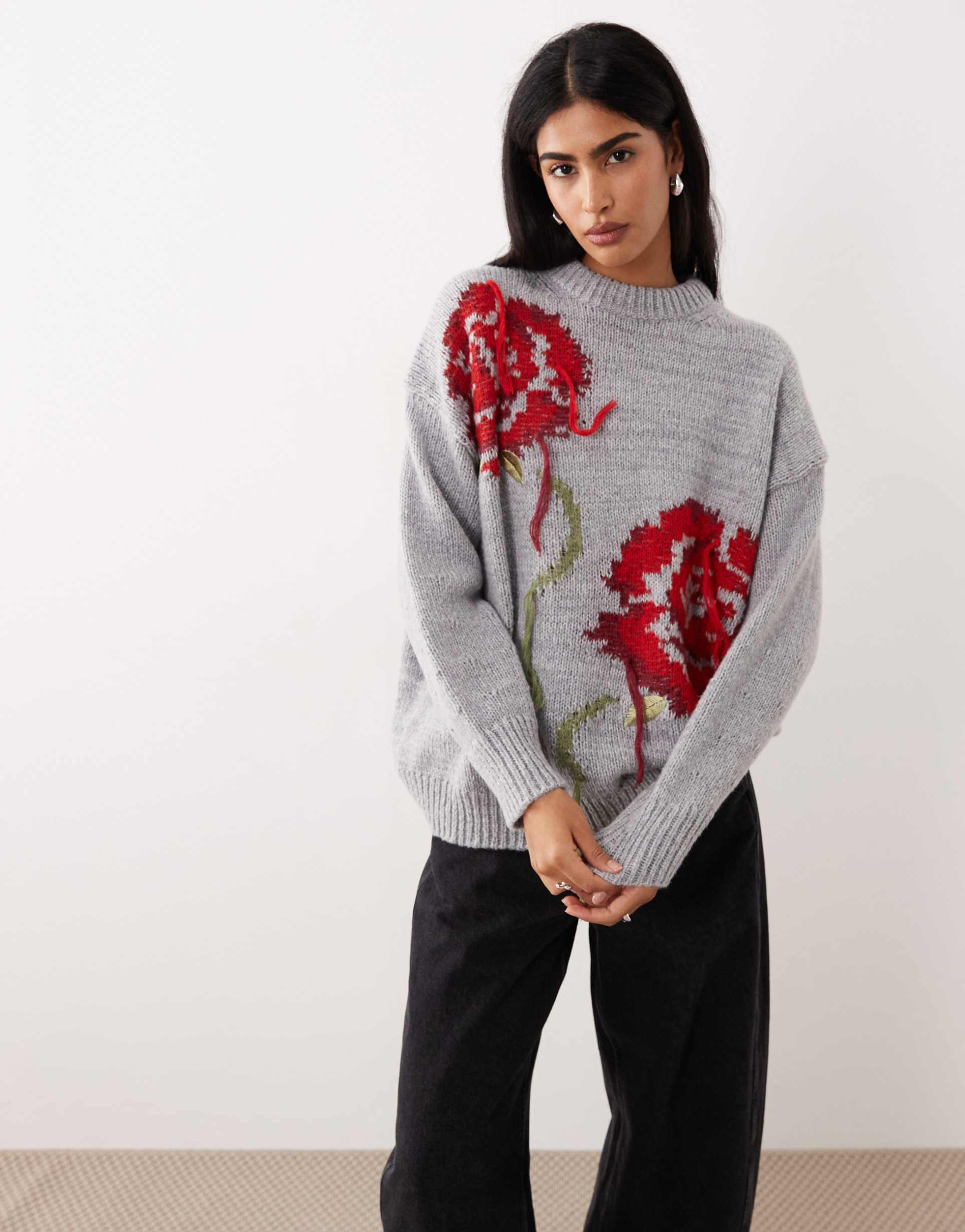 This ASOS DESIGN oversized sweater features a cozy polyester knit in a soft gray base color, adorned with striking red floral embroidery on the front. Designed with a classic crew neck and drop shoulder sleeves, it offers a relaxed, hip-length silhouette perfect for casual and streetwear looks during autumn and winter. The ribbed trim adds subtle texture, enhancing its casual chic style. Ideal for lounging, casual outings, or street style, this pullover sweater combines comfort with eye-catching floral detailing for a stylish seasonal staple.