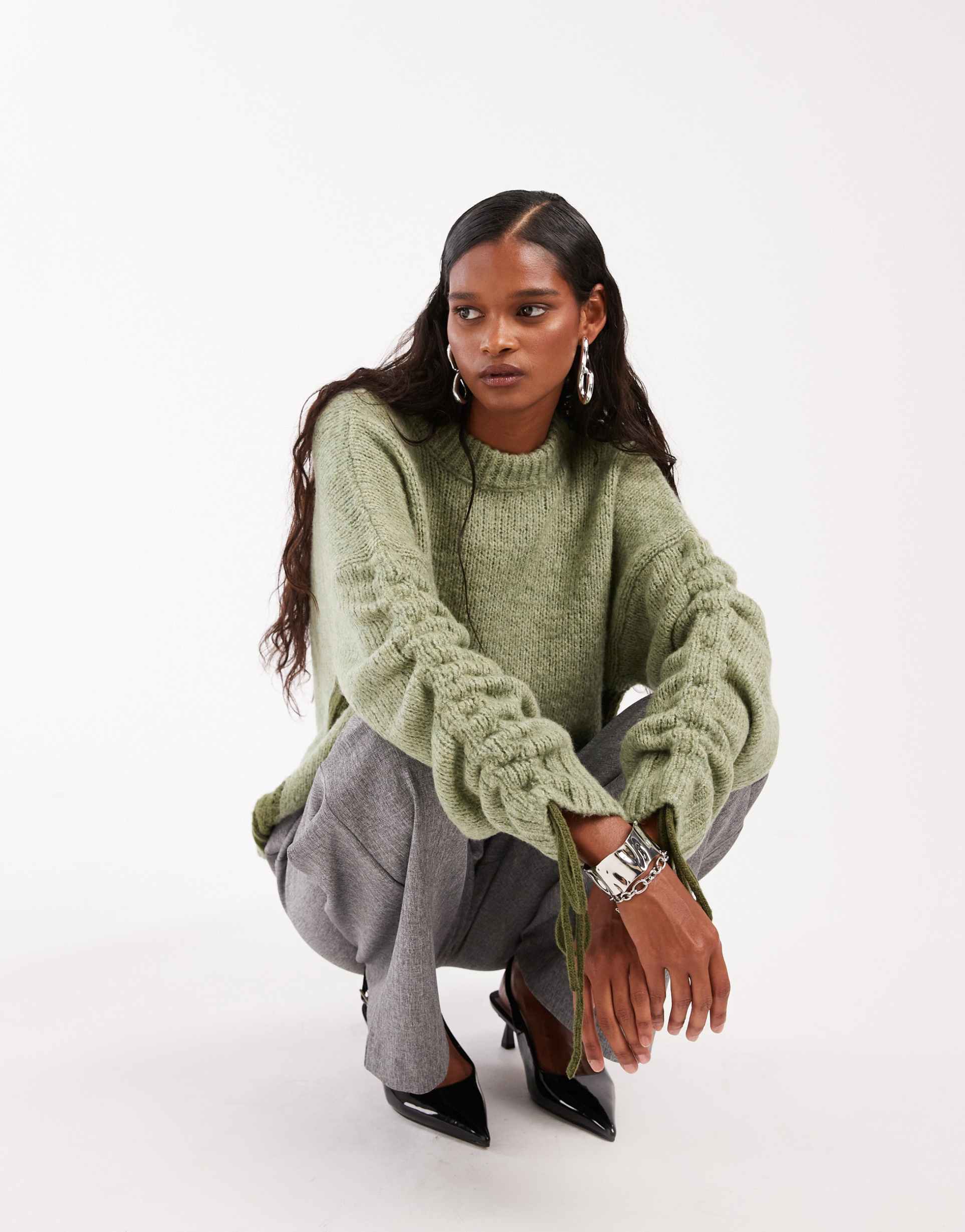 ASOS DESIGN RUCHED SLEEVE SWEATER IN GREEN