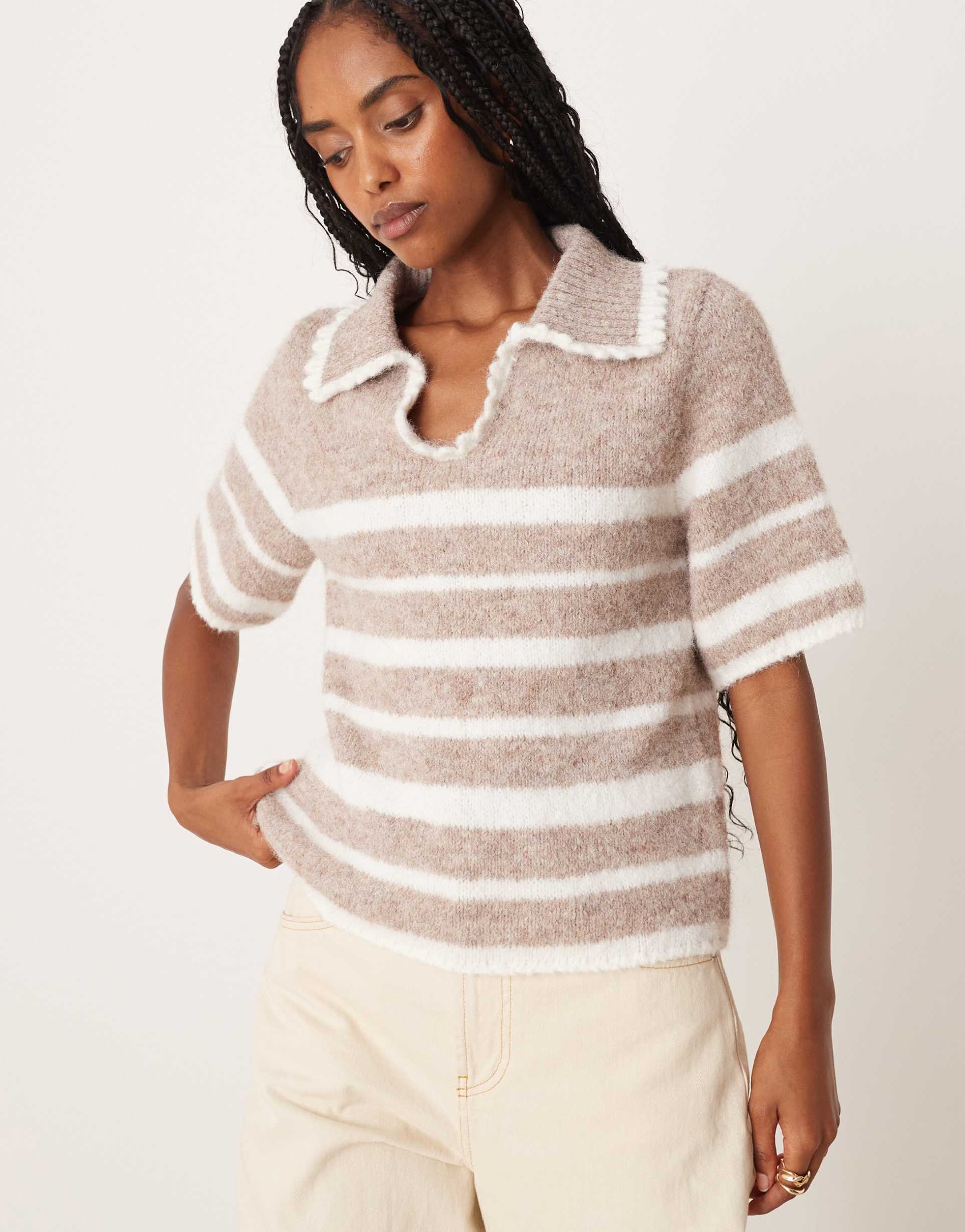 This ASOS DESIGN knit polo features a regular fit with a waist-length silhouette, crafted in a fluffy knit blend of polyester, polyamide, and wool. The short half sleeves and classic polo collar with delicate frill detail add a feminine touch. The cream base colour is accented by white stripes all over, complemented by ruffled trims on the collar. Perfect for casual outings, workwear, or brunch, this minimalist striped knit offers cozy texture and understated elegance for spring and autumn seasons.