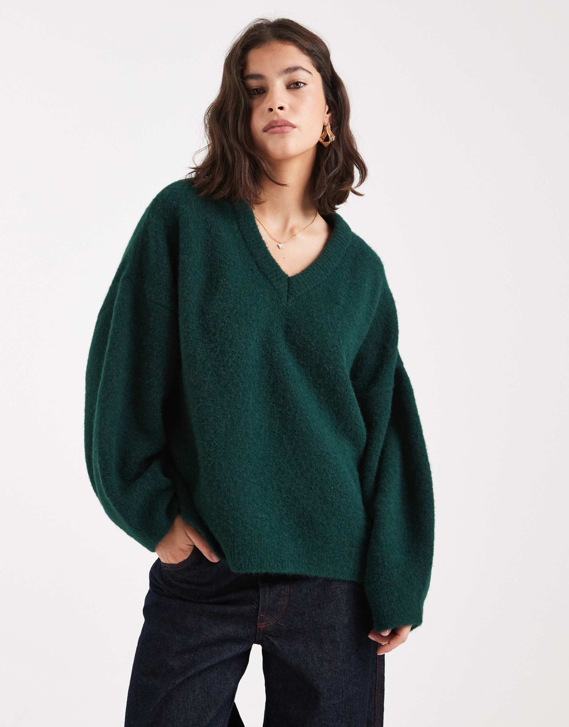 This ASOS DESIGN sweater features a structured fluffy knit in a rich dark green hue, offering warmth and texture perfect for autumn and winter. The oversized fit and hip-length silhouette combine comfort with style, enhanced by balloon sleeves and a flattering V-neckline. Crafted from a blend of polyester, acrylic, polyamide, wool, and elastane, this pullover piece provides a cozy and casual chic look ideal for relaxed streetwear, loungewear, or casual outings.