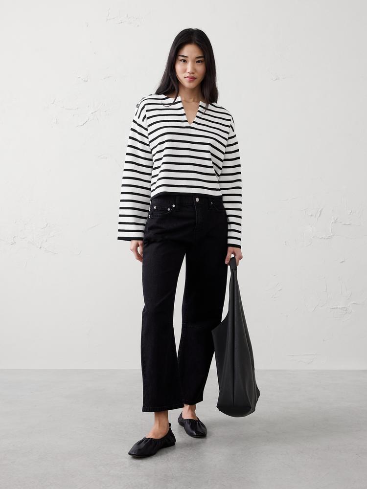 STRIPED BUTTON NOTCH-NECK SWEATER
