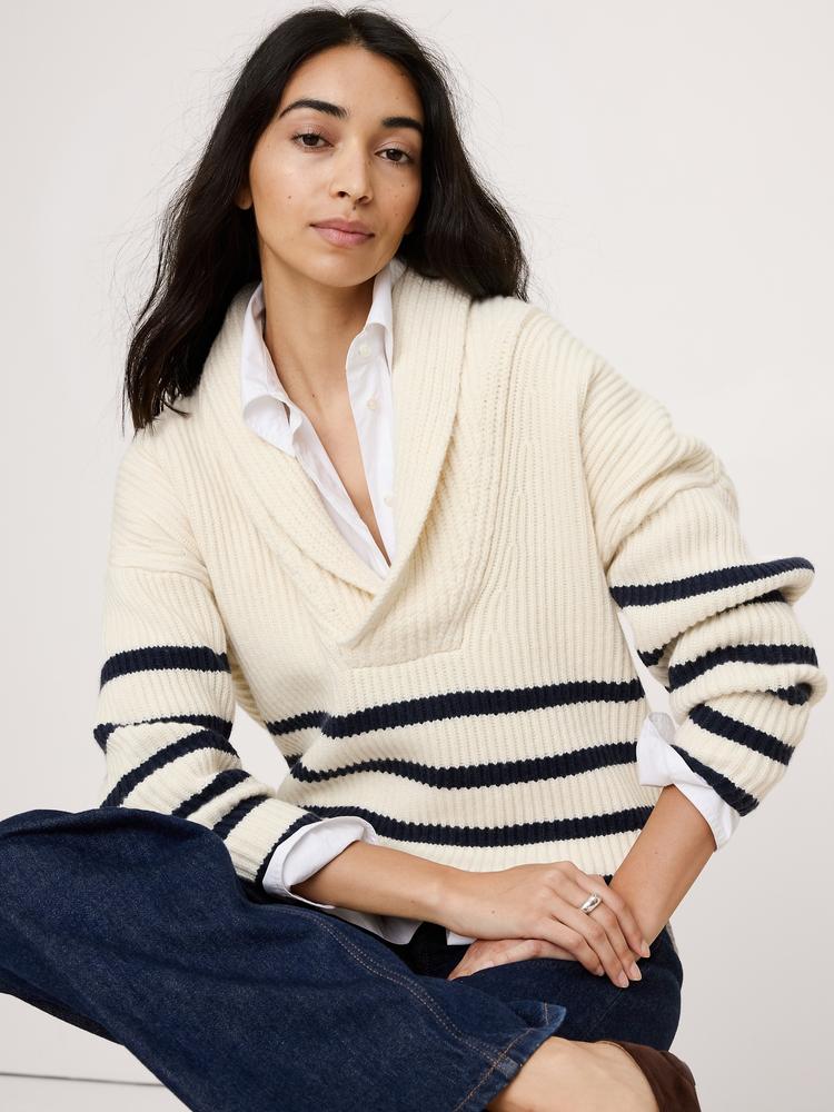 MERINO-COTTON SHAWL-COLLAR SWEATER