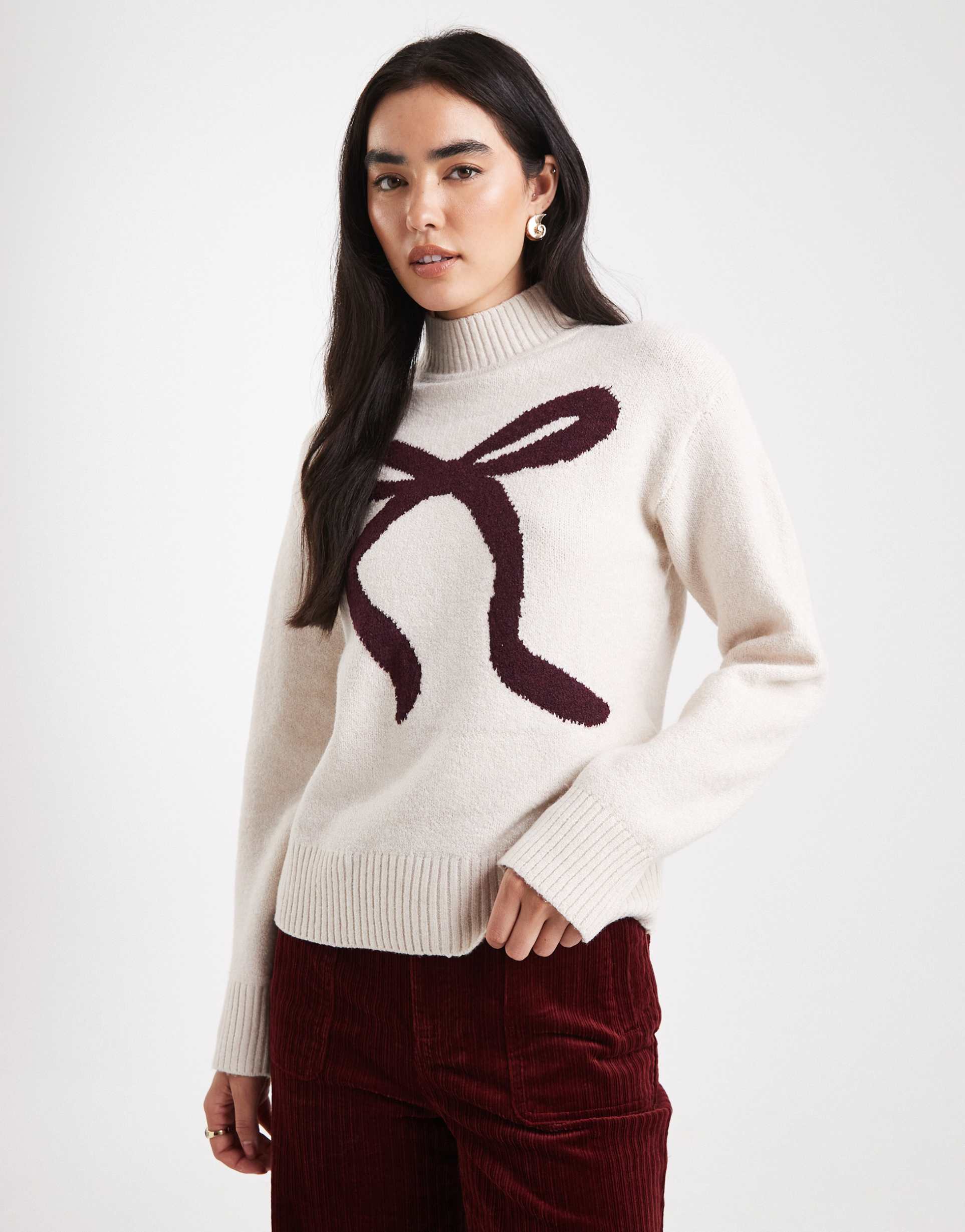 BRAVE SOUL MOCK NECK SWEATER WITH BOW PRINT IN CREAM