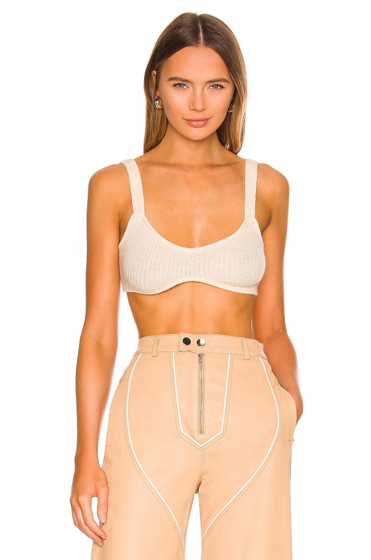 Soft ribbed knit fabric and a fitted silhouette define this bralette with a U-neck and wide straps for comfort and style. Its cropped length and curved hem add a subtle design touch, making it ideal for casual days, loungewear, or vacation wear. Crafted from a blend of acrylic, nylon, wool, and elastane, this cream bralette offers cozy stretch and effortless layering potential for all seasons.