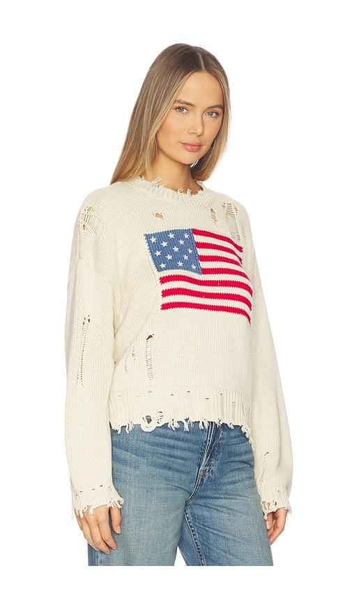 DENIMIST OVERSIZED CROPPED AMERICAN FLAG SWEATER IN TAN.