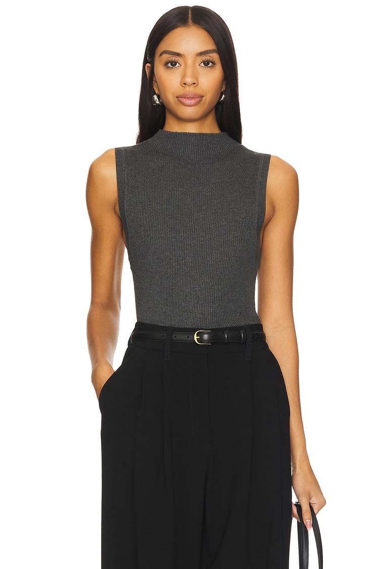 A sleek sleeveless tank crafted in a rib knit blend of viscose and silk offers a fitted silhouette with a sophisticated mock neck. The matte dark gray hue lends a minimalist and classic vibe, perfect for layering or standalone wear. This hip-length piece slips on easily, presenting a clean covered back and strapless sleeve styling that enhances everyday and business casual wardrobes. Ideal for casual outings, workwear, or business casual occasions, its luxurious fabric and refined fit make it a versatile staple across all seasons.