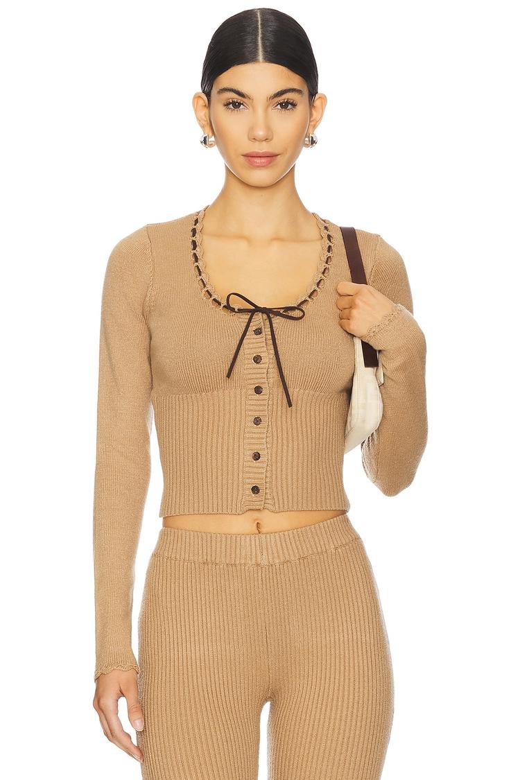 Crisp ribbed knit in a warm matte tan hue shapes this cropped cardigan with a fitted silhouette perfect for layering. Featuring a round neck accented by a self-tie faux leather bow and front button closure, this midweight knit pairs long sleeves with ribbed trim for understated texture. Ideal for casual outings, brunch, or streetwear looks in cooler seasons, the cardigan blends comfort with minimalist modern style for versatile wardrobe appeal.