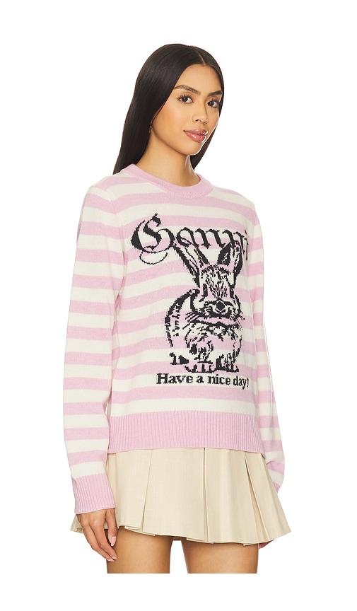 GANNI STRIPED BUNNY GRAPHIC SWEATER IN PINK,IVORY.