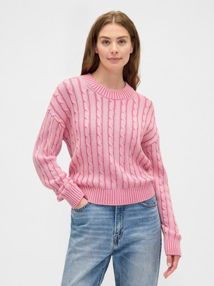 This relaxed fit cable-knit sweater features a classic crew neck and long regular sleeves, offering a comfortable yet stylish silhouette. Crafted from a soft pink knit fabric, its textured cable pattern runs all over the waist-length body and sleeves. Ideal for casual days, loungewear, or light workwear in cooler seasons like autumn, winter, and spring, this pullover sweater combines cozy warmth with minimalist charm. Its ribbed hems and cuffs add subtle structure, making it a versatile layering piece for everyday wear.