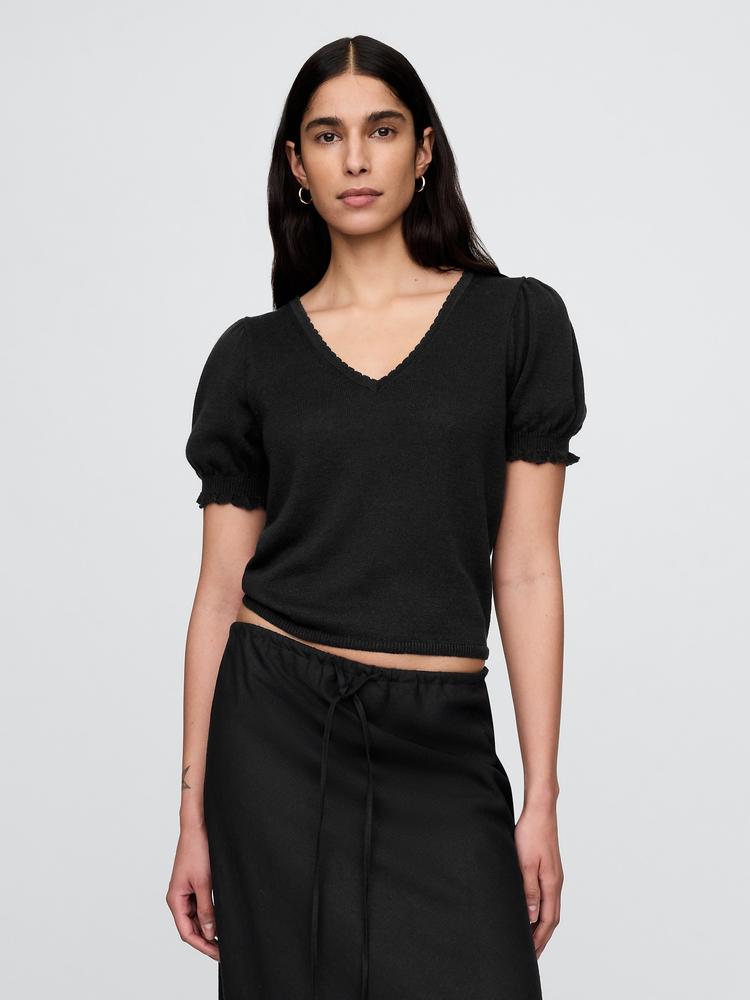 LINEN-BLEND PUFF-SLEEVE SWEATER TOP