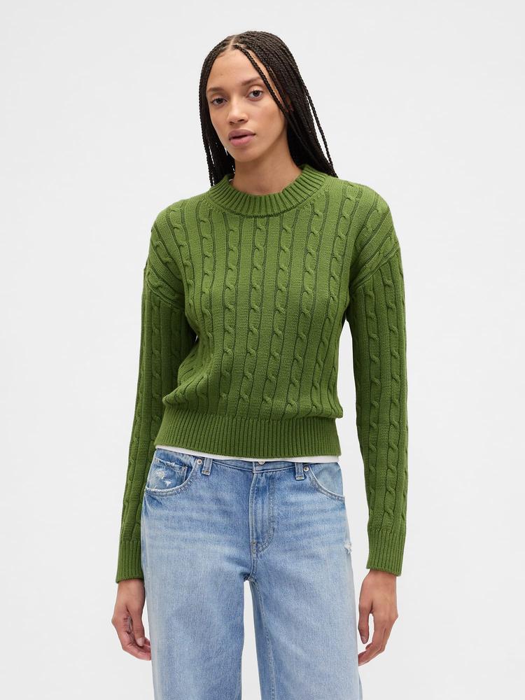 This relaxed fit cable-knit crewneck sweater in a vibrant green hue offers timeless casual chic style with its classic cable knit texture all over. Crafted from a cozy knit fabric, it features a comfortable crew neck and long sleeves, ending at waist length for easy layering. Perfect for autumn, winter, and spring, this sweater suits casual outings, loungewear, and laid-back work environments. Its textured cable knit design brings a tactile element to your outfit, making it a versatile piece for everyday wear.