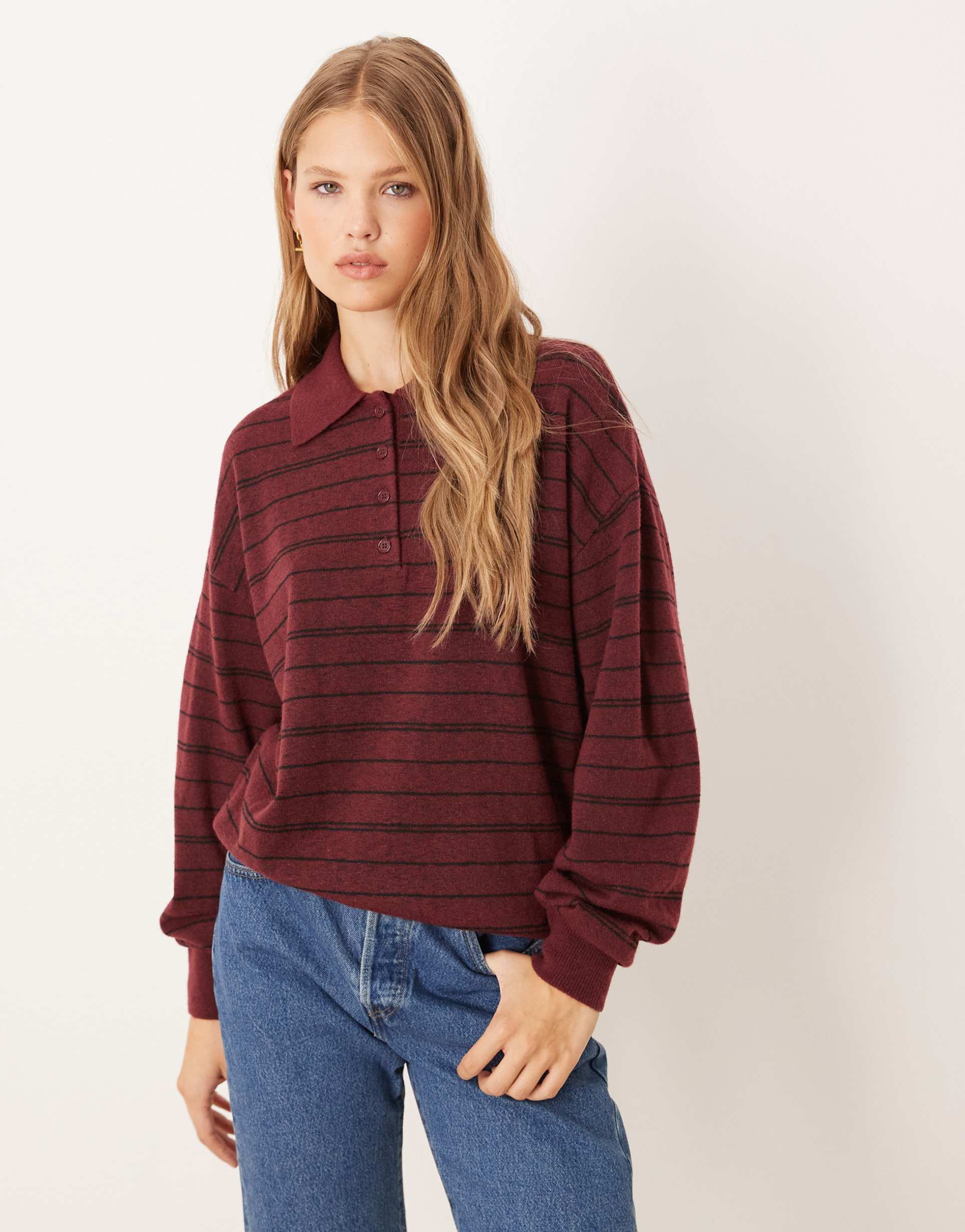 GINA TRICOT LONG SLEEVE POLO COLLAR KNIT SWEATER IN BURGUNDY RED STRIPES