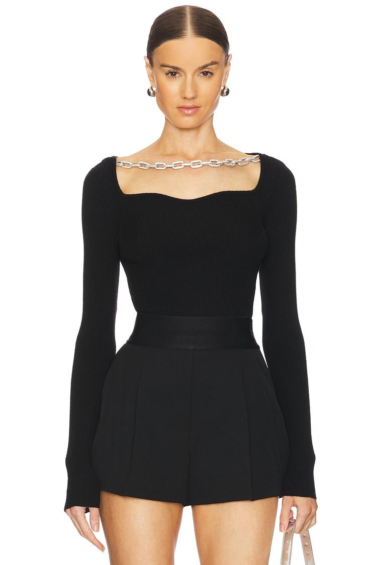 Midweight rib knit wool blend defines this fitted sweater, featuring a flattering square neckline and long sleeves for cooler seasons. The hip-length silhouette contours elegantly with a pull-on style, while a stone-embellished chain detail at the collar adds a sophisticated touch. This classic and minimalist sweater suits casual days, workwear, and date nights, offering refined comfort and style with an Italian craftsmanship feel.
