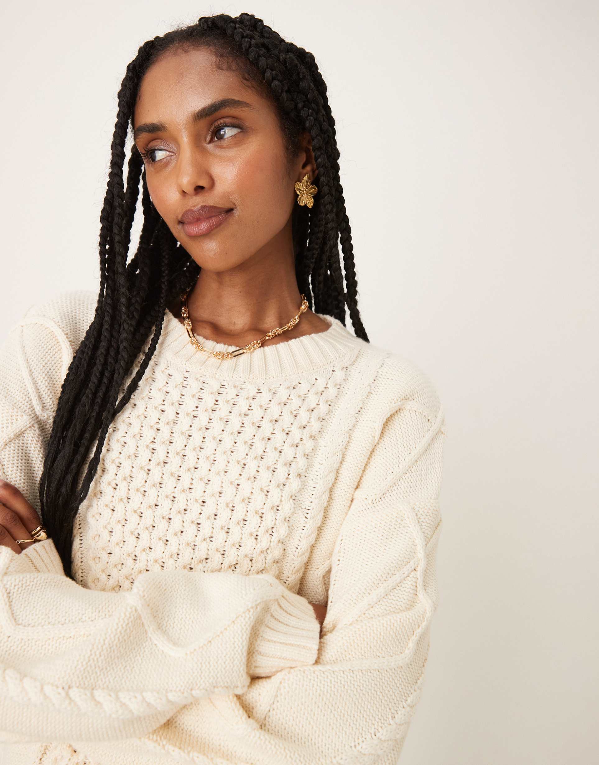 This off-white oversized sweater from Glamorous features a cozy cable knit texture with a layered, crossover pattern on the front. Crafted from 100% cotton, it offers breathable warmth ideal for autumn and winter. The classic crew neck and long regular sleeves emphasize comfort and casual chic style, perfect for loungewear, casual outings, or relaxed weekend wear. Its relaxed fit and pullover closure make it an effortless layering piece for cooler days, combining softness and texture for a stylish yet comfortable look.