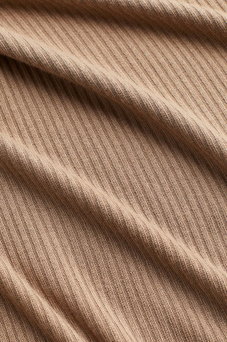 This fitted boat-neck sweater features a ribbed knit texture in a matte taupe shade, offering a classic and minimalist style. The hip-length silhouette is complemented by extra-long sleeves with slits at the cuffs and side slits at the hem, adding subtle design details and a touch of ease. Crafted in a knit fabric, it is perfect for layering during autumn, winter, and spring. Ideal for casual outings, workwear, and comfortable loungewear, this sweater balances style and comfort effortlessly.