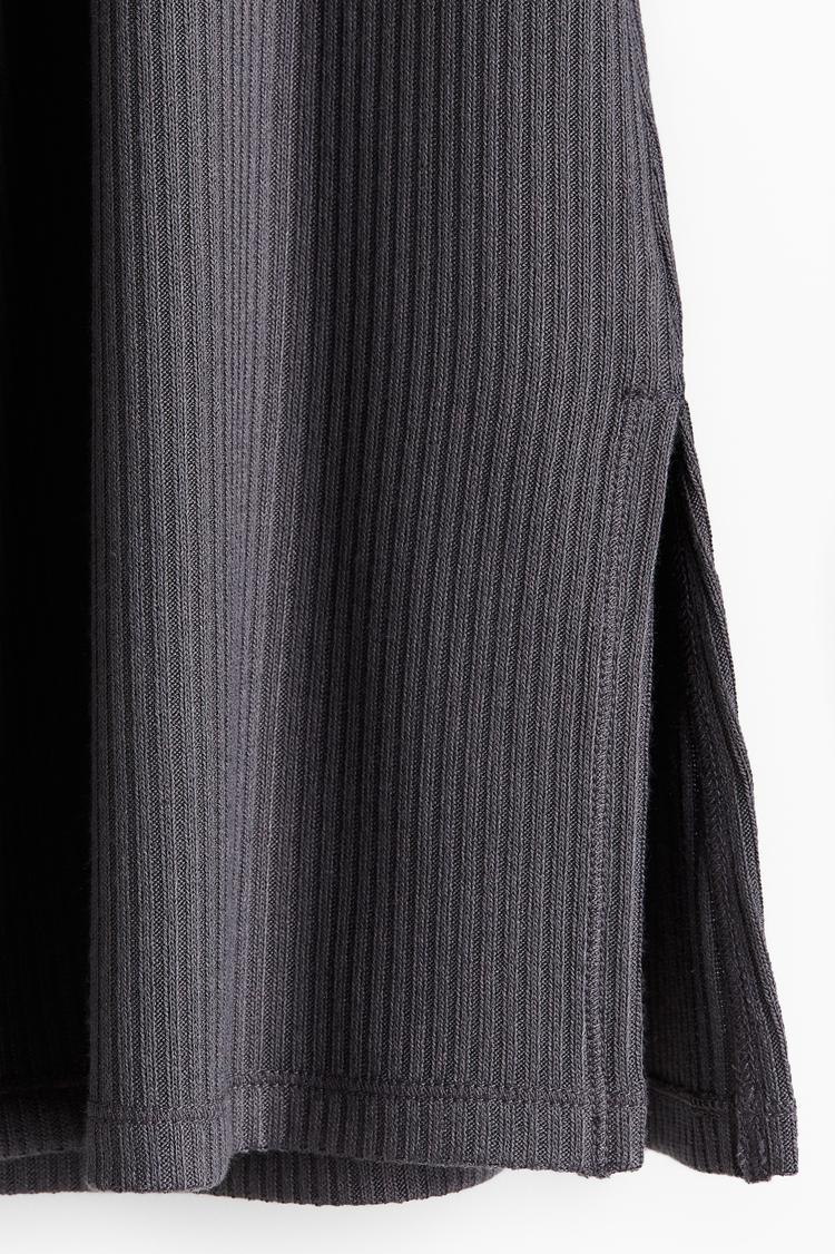 This fitted sweater features a classic boat neck and is crafted from a ribbed knit fabric in a rich charcoal hue. The design includes subtle side slits at the hem, adding ease and movement, complemented by extra-long sleeves with slits at the cuffs for a modern twist. Ideal for layering during autumn and winter, its minimalist style suits casual, workwear, and business casual occasions. The textured knit provides both comfort and understated style, making it a versatile staple in any wardrobe.