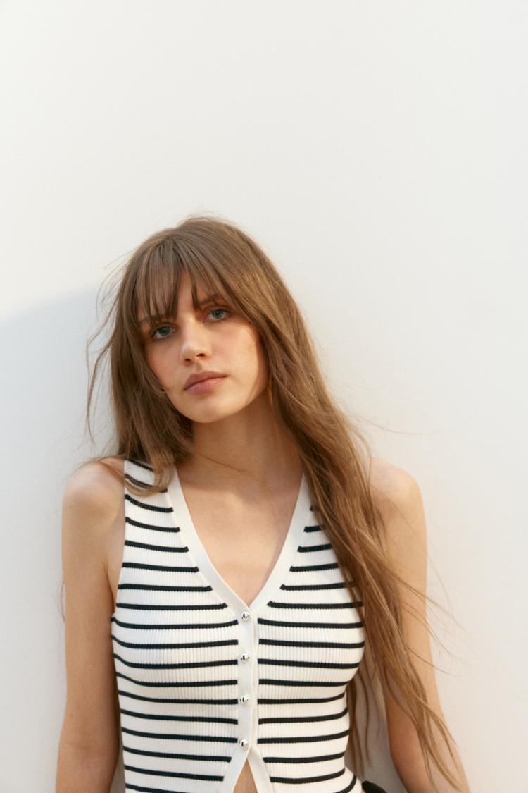 This button-front sweater vest features a fitted, cropped silhouette crafted from soft, fine-knit fabric with a classic V-neckline. The sleeveless design highlights the minimalist striped pattern in black and white, complemented by shiny metal buttons down the front for a polished touch. Ideal for layering during spring and autumn or wearing solo in summer, this vest lends itself well to casual outings, brunch dates, and business casual settings. The knit texture and sleek finish add both comfort and style to your seasonal wardrobe.