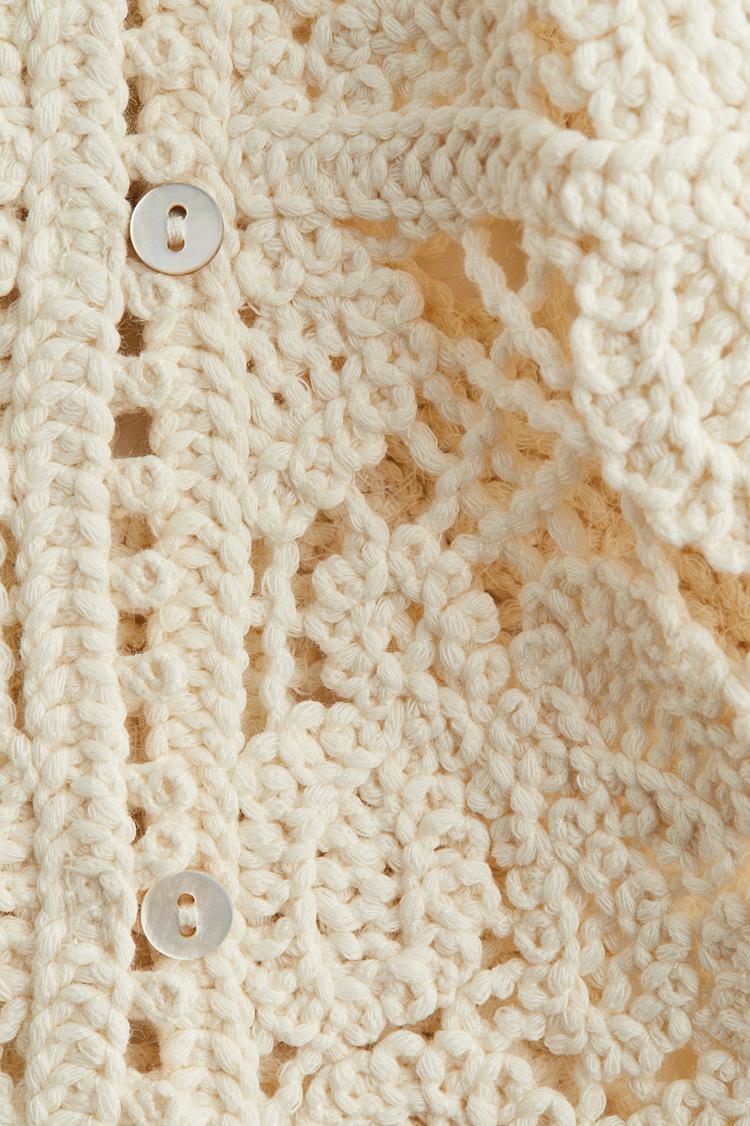 Soft, knit vest with a crocheted look and delicate picot trim. Round neckline and pearlescent buttons at front.