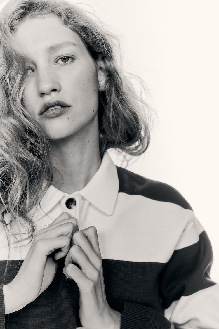 Loose-fit polo sweater in a soft, fine knit. Collar, short button placket, dropped shoulders, and long sleeves. Ribbing at cuffs and hem.