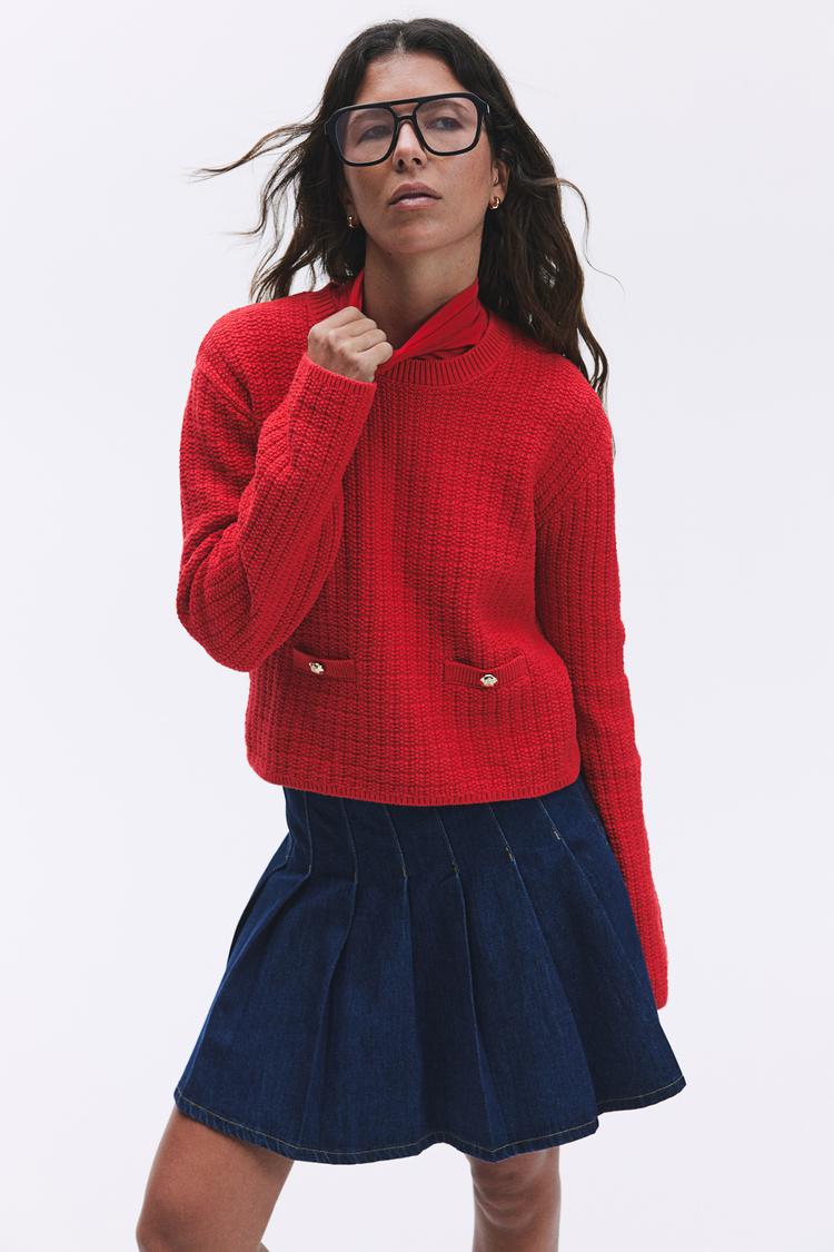 Short sweater in a moss-knit cotton blend. Round, ribbed neckline, mock front pockets with a decorative metal button, and long sleeves.
